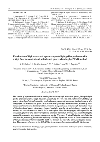 Приведены результаты экспериментальных исследований по получению высокоапертурных заготовок кварцевых волоконных световодов с повышенным содержанием фтора (до 7 вес. %) и утолщенной оболочкой на основе кварцевого стекла, легированного фтором, при помощи неизотермической плазмы резонансного локального СВЧразряда (PCVD-метод). Достигнуты высокие скорости осаждения слоев кварцевого стекла, легированного фтором (вплоть до 3 мкм/мин), и соотношения s/a (где s – диаметр заготовки, a – диаметр сердцевины) на уровне 1,3–1,4 и выше.