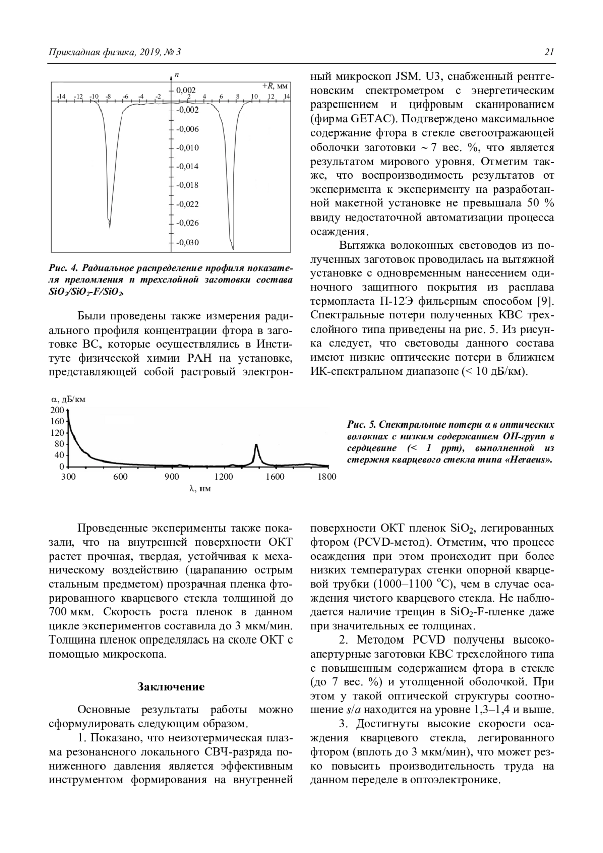 The results of experimental studies on the fabrication of high numerical quartz fiberoptic light guides preforms (with a high fluorine content (up to 7 wt. %) and a thickened cladding of quartz glass doped with fluorine) by nonisothermal plasma of resonance local microwave discharge (PCVD method) are given. It is shown that by using a nonisothermal plasma of resonance local microwave discharge at low pressure, it is possible to achieve high deposition rates of fluorine doped quartz glass layers (up to 3 μm/min) and the s/a ratio (where s – preform diameter, a – core diameter) at level 1.3–1.4 and higher. That discharge type, which provides an increased efficiency of a microwave plasma-chemical deposition process, was formed using the waveguide-resonator microwave plasmatron on the H10 wave. It should also be noted that in this case the process of fluorinated reflecting cladding deposition occurs at lower temperatures of the quartz support tube wall (1000–1100 oС) than in the case of a pure quartz glass deposition. The presence of cracks in the SiO2-F-film is not observed even at considerable thicknesses.