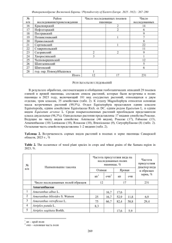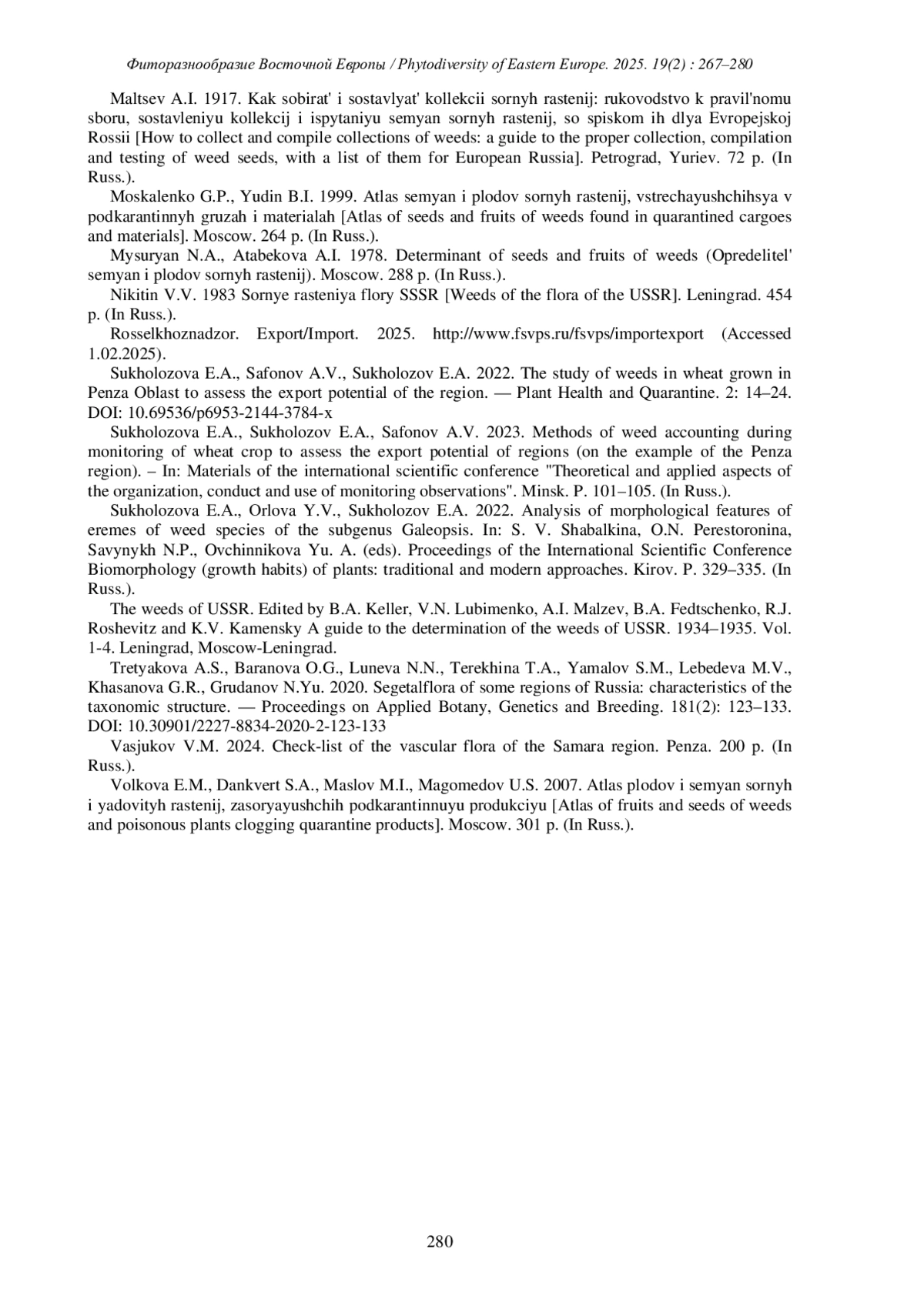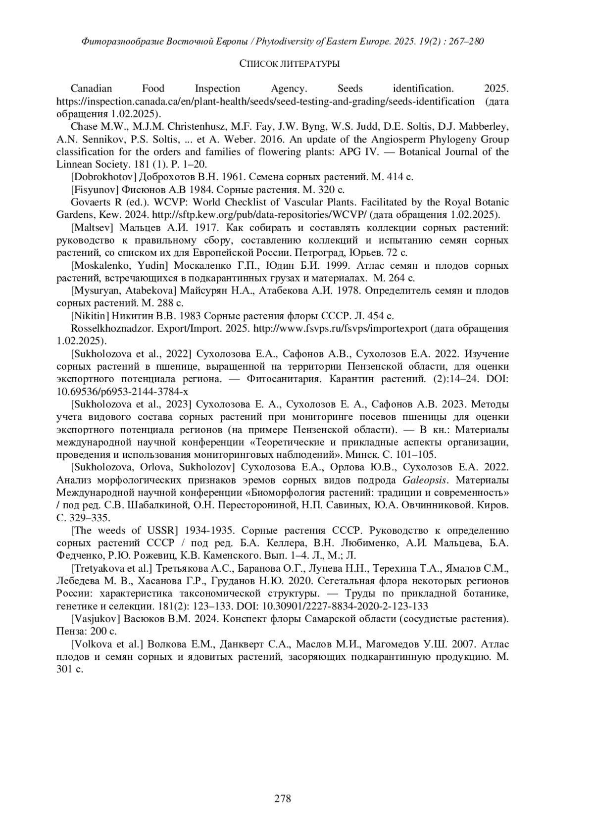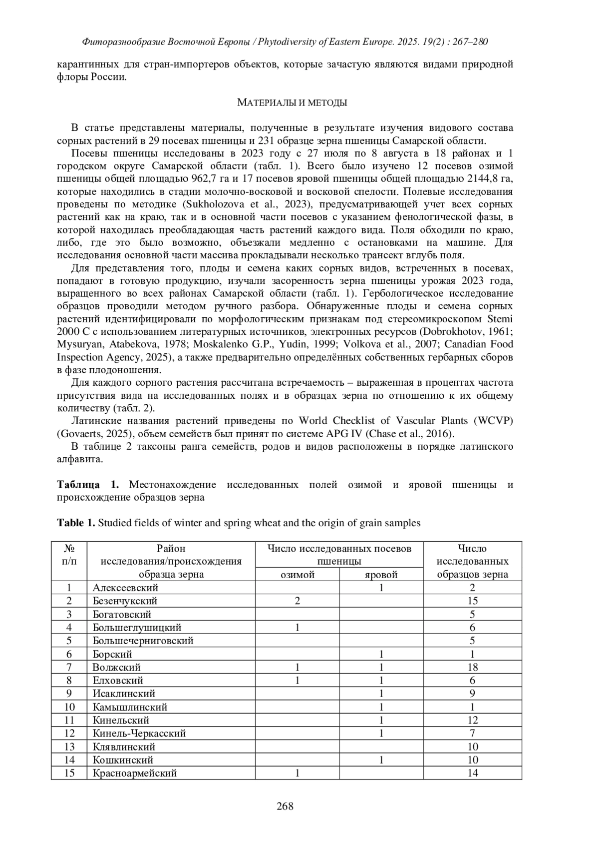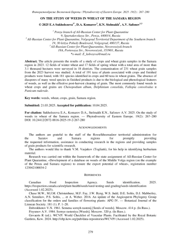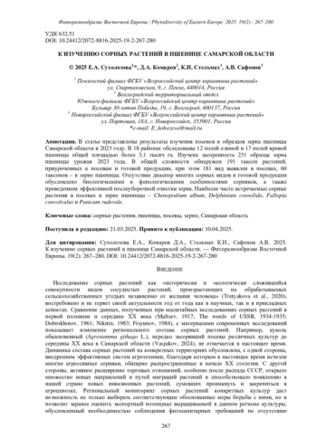 СУХОЛОЗОВА Е.А., КОМАРОВ Д.А., СТЕЛЬМАХ К.Н., САФОНОВ А.В. К ИЗУЧЕНИЮ СОРНЫХ РАСТЕНИЙ В ПШЕНИЦЕ САМАРСКОЙ ОБЛАСТИ // ФИТОРАЗНООБРАЗИЕ ВОСТОЧНОЙ ЕВРОПЫ. 2025. Т. 19 № 2