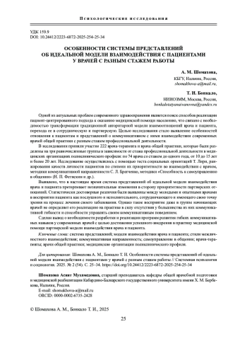 Статья: ОСОБЕННОСТИ СИСТЕМЫ ПРЕДСТАВЛЕНИЙ ОБ ИДЕАЛЬНОЙ МОДЕЛИ ВЗАИМОДЕЙСТВИЯ С ПАЦИЕНТАМИ У ВРАЧЕЙ С РАЗНЫМ СТАЖЕМ РАБОТЫ (2025)