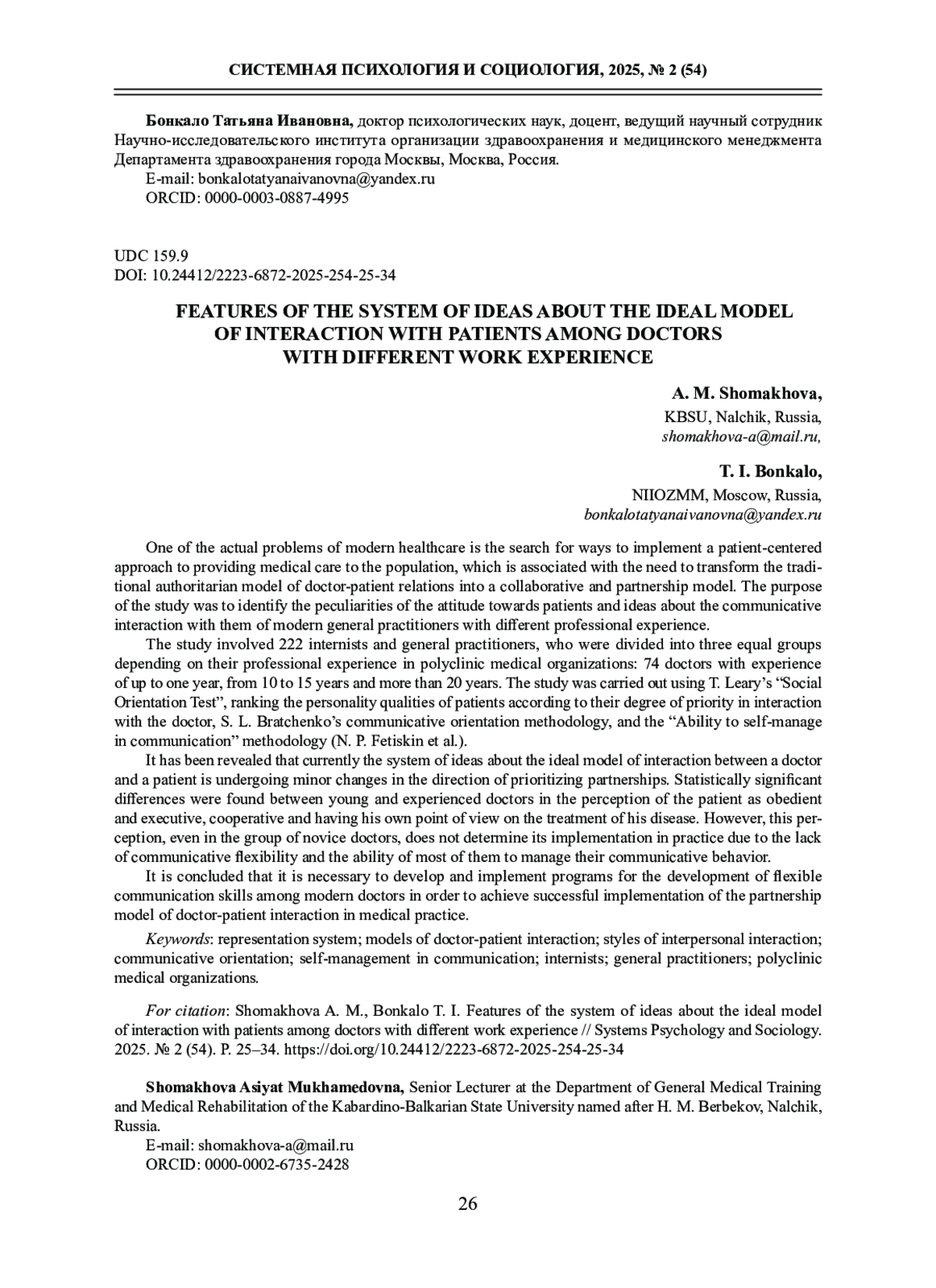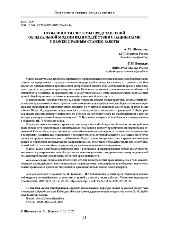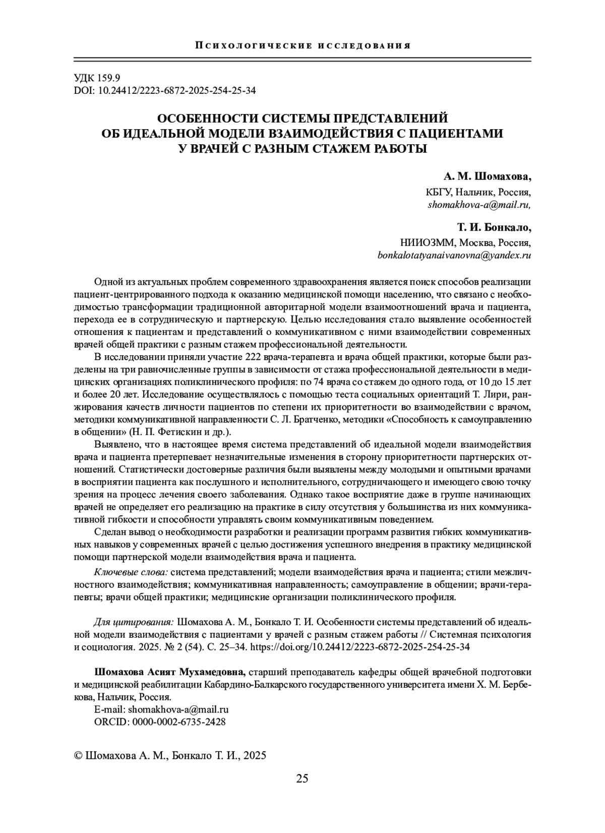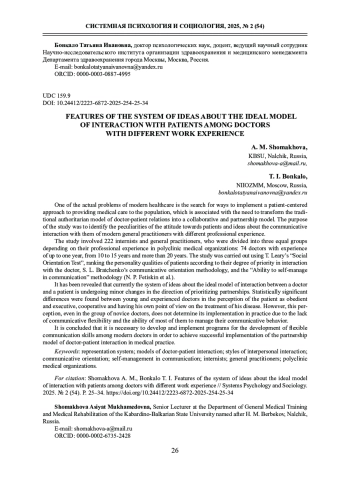 ШОМАХОВА А. М., БОНКАЛО Т. И. ОСОБЕННОСТИ СИСТЕМЫ ПРЕДСТАВЛЕНИЙ ОБ ИДЕАЛЬНОЙ МОДЕЛИ ВЗАИМОДЕЙСТВИЯ С ПАЦИЕНТАМИ У ВРАЧЕЙ С РАЗНЫМ СТАЖЕМ РАБОТЫ // СИСТЕМНАЯ ПСИХОЛОГИЯ И СОЦИОЛОГИЯ. 2025. № 2 (54)