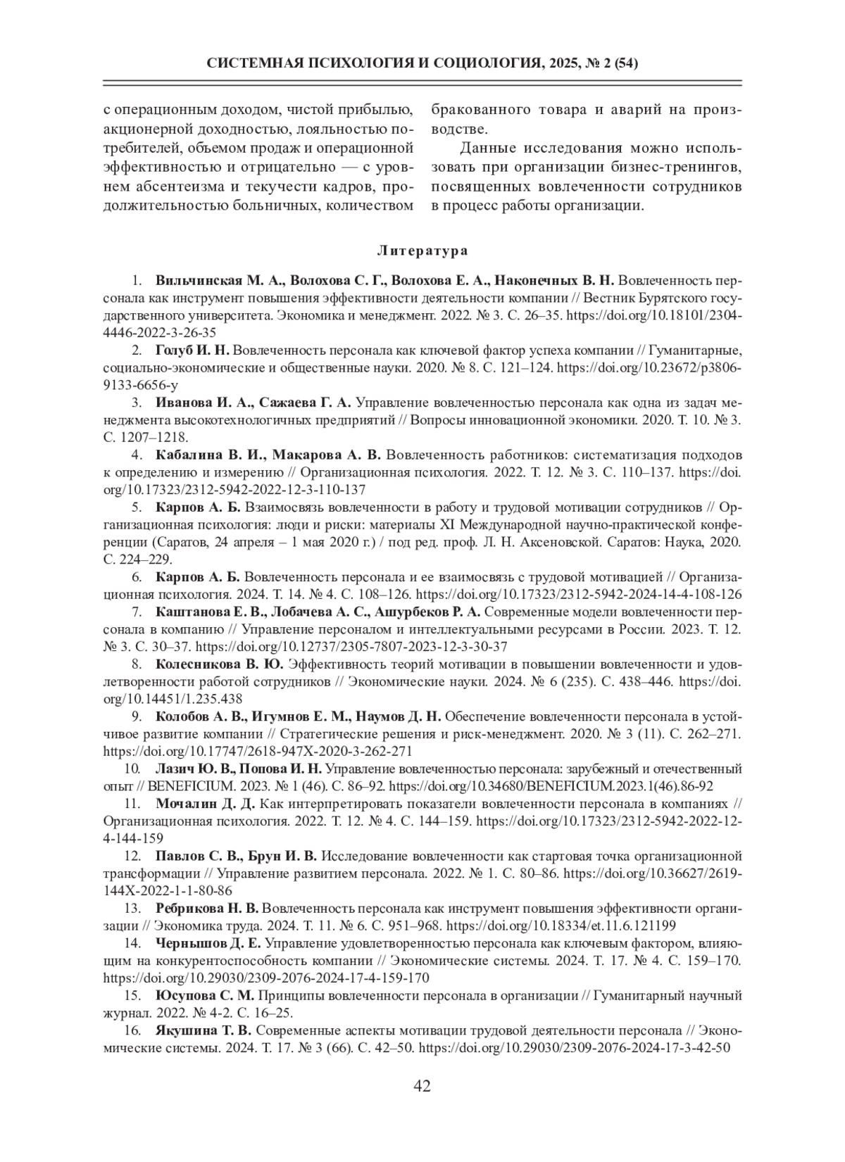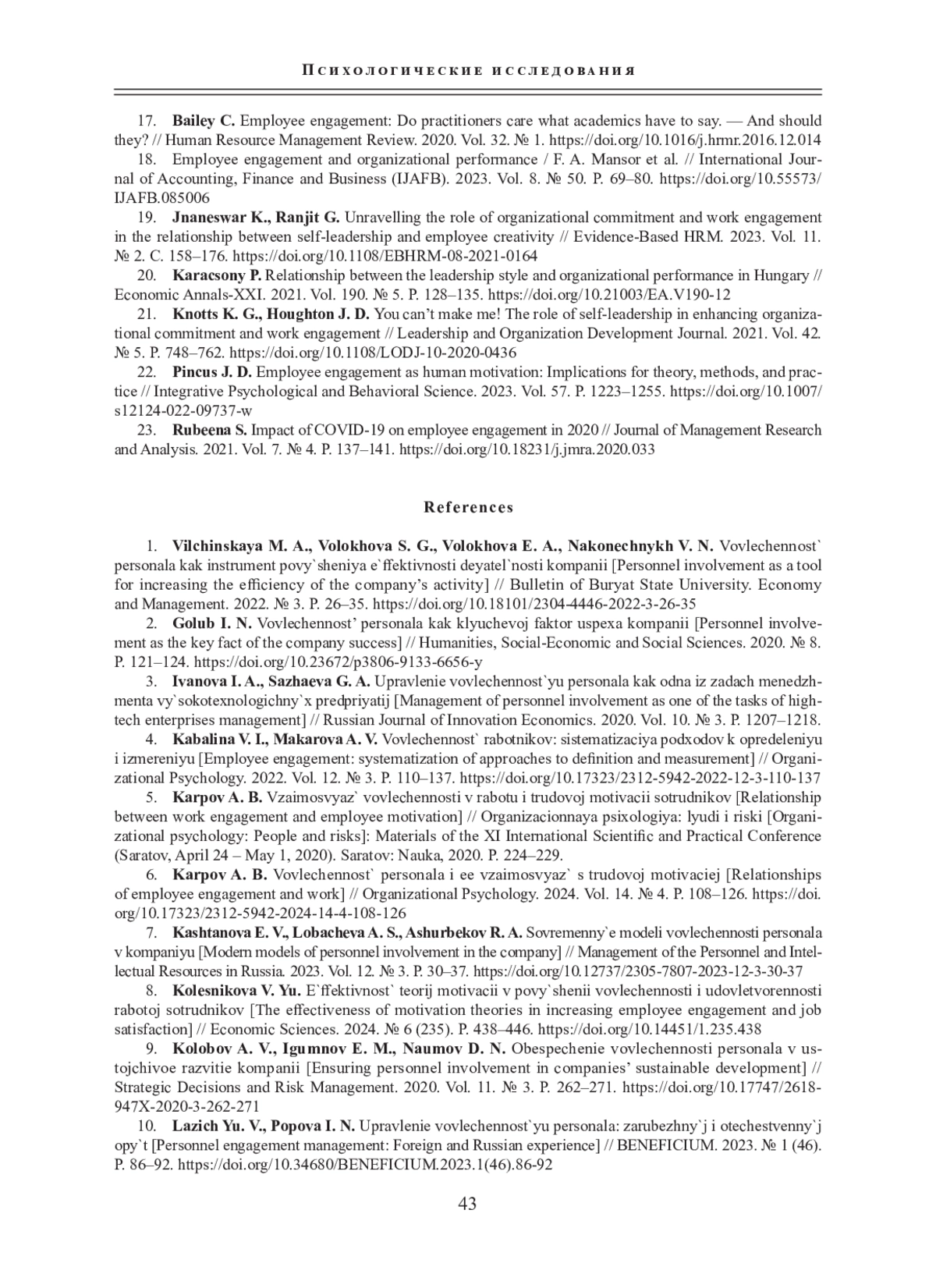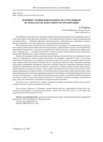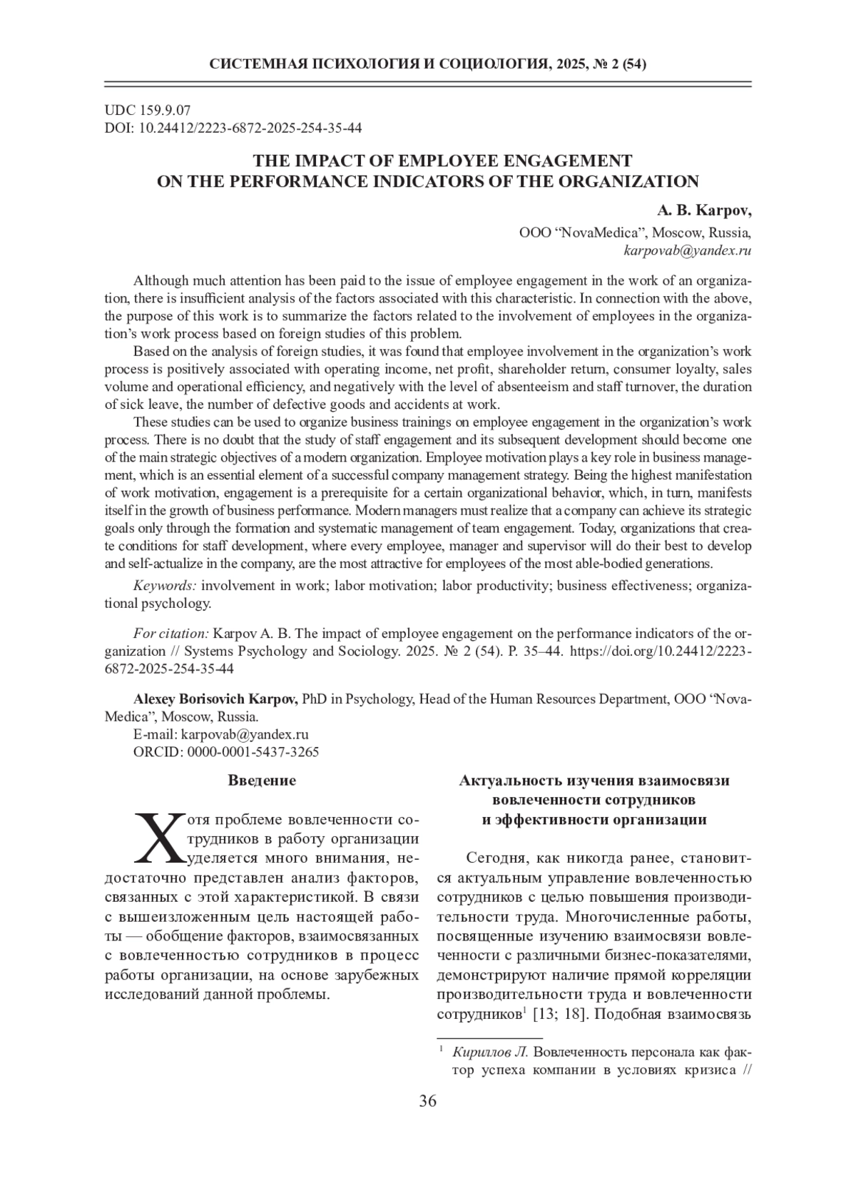 Хотя проблеме вовлеченности сотрудников в работу организации уделяется много внимания, недостаточно представлен анализ факторов, связанных с этой характеристикой. В связи с вышеизложенным цель настоящей работы - обобщение факторов, взаимосвязанных с вовлеченностью сотрудников в процесс работы организации, на основе зарубежных исследований данной проблемы.