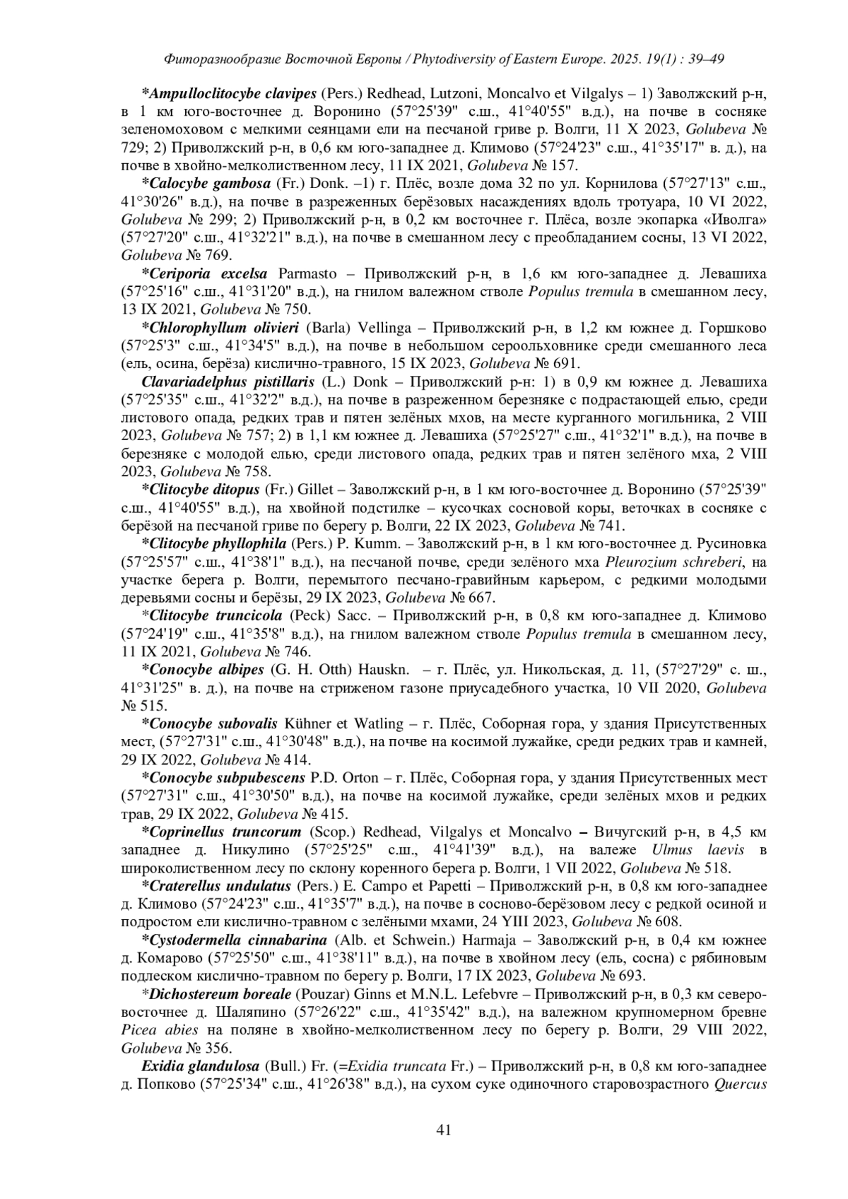 4. [Golubeva et al.] Голубева М.А., Капитонов В.И., Дедюхин А.В., Сорокин А.И. 2023a. Новые для Ивановской области виды макромицетов с территории Плёсского музея-заповедника. - Фиторазнообразие Восточной Европы. 17(3): 15-31. DOI: 10.24412/2072-8816-2023-17-3-15-31 EDN: JMYDGQ