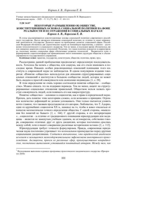 КОРНЕВ А. В., КОРОЛЕВА Е. В. НЕКОТОРЫЕ РАЗМЫШЛЕНИЯ ОБ ОБЩЕСТВЕ, КОНСТИТУЦИОННЫХ ОСНОВАХ СОЦИАЛЬНОЙ ПОЛИТИКИ НА ФОНЕ РЕАЛЬНОСТИ И ЕЕ ОТРАЖЕНИЯ В СОЦИАЛЬНЫХ НАУКАХ // УЧЕНЫЕ ЗАПИСКИ КРЫМСКОГО ФЕДЕРАЛЬНОГО УНИВЕРСИТЕТА ИМЕНИ В. И. ВЕРНАДСКОГО. ЮРИДИЧЕСКИЕ НАУКИ. 2025. ТОМ 11. №2