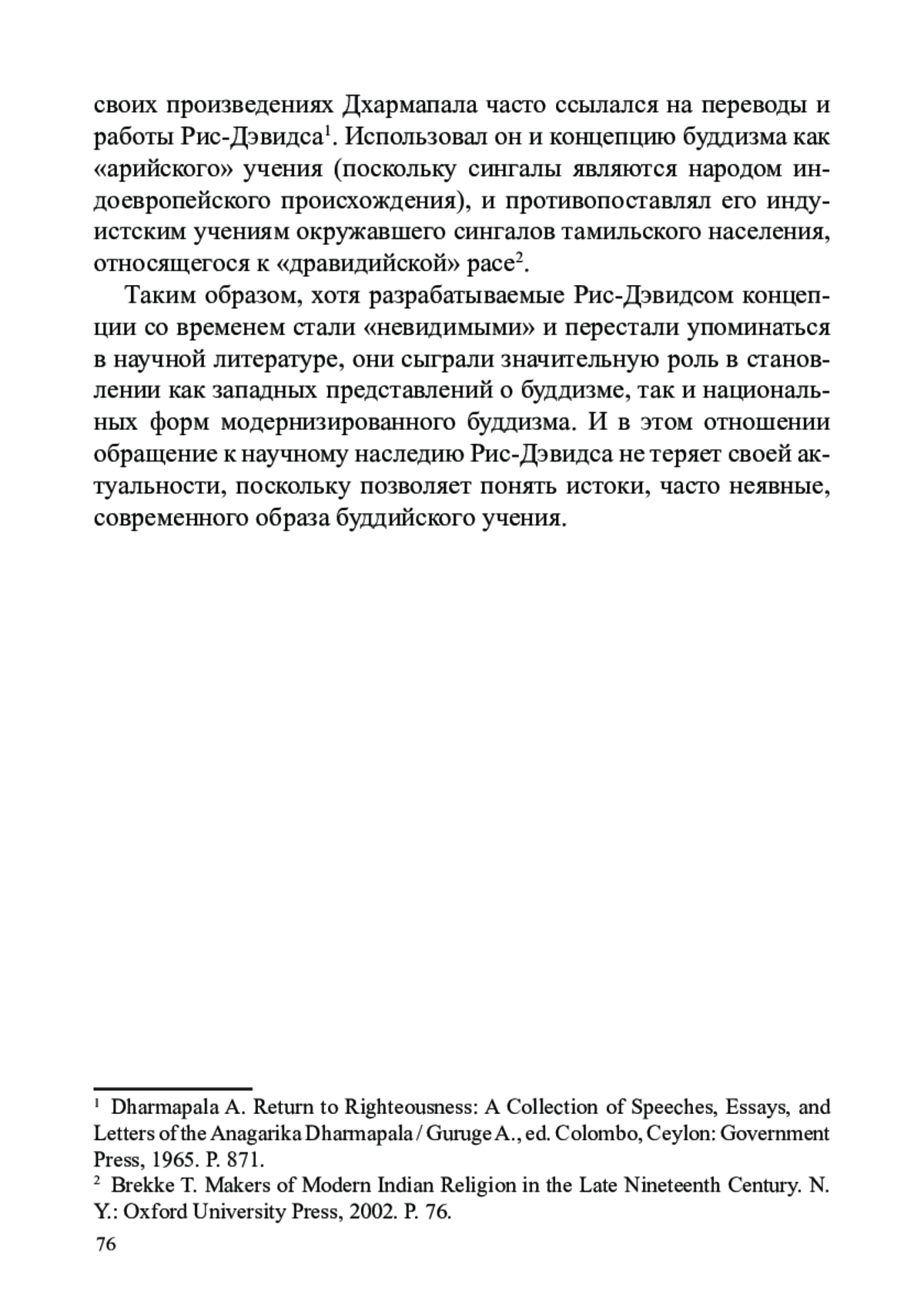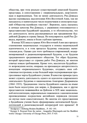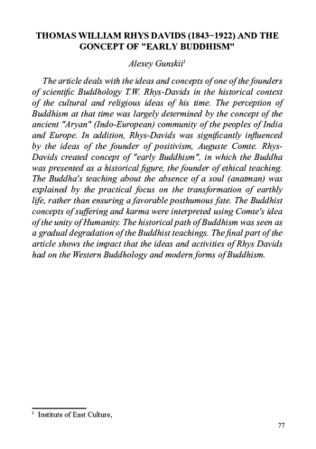 В статье рассматриваются идеи и концепции Т. В. Рис-Дэвидса, одного из основателей научной буддологии, в историческом контексте культурных и религиоведческих представлений его времени. Описывается гипотеза «восточного Ренессанса», одной из составляющих которого было знакомство Запада с буддийскими понятиями и теориями. Восприятие буддизма в то время во многом определялось представлением о древней «арийской» (индоевропейской) общности народов Индии и Европы. Также значительное влияние на Рис-Дэвидса оказали идеи основателя позитивизма О. Конта. Рис-Дэвидс разрабатывал концепцию «первоначального буддизма», в рамках которой Будда был представлен как исторический персонаж, основатель этического учения, а его традиционный образ подвергся полной «демифологизации». Буддийская нирвана рассматривалась как моральное совершенство, обретаемое в этой жизни. Учение Будды об отсутствии души объяснялось практической направленностью на преобразование земной жизни, а не обеспечением благоприятной посмертной судьбы. Буддийские концепции страдания и кармы были интерпретированы с использованием идеи Конта о единстве Человечества. Исторический путь буддизма рассматривался как постепенная деградация буддийского учения, происходящая вследствие вторжений в Индию неарийских племен, не способных воспринять положения первоначального буддизма. В заключении показано влияние деятельности и концепций Рис-Дэвидса на западную буддологию и современные формы буддизма.