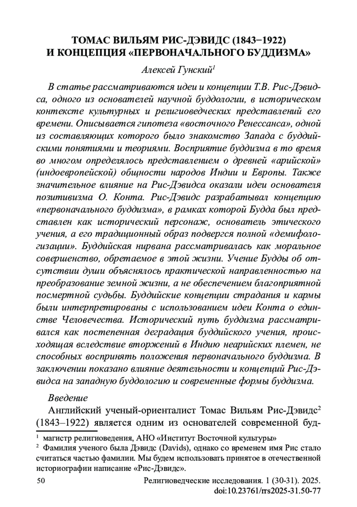 ГУНСКИЙ А. ТОМАС ВИЛЬЯМ РИС-ДЭВИДС (1843−1922) И КОНЦЕПЦИЯ «ПЕРВОНАЧАЛЬНОГО БУДДИЗМА» // РЕЛИГИОВЕДЧЕСКИЕ ИССЛЕДОВАНИЯ. 2025. № 1 (30-31)