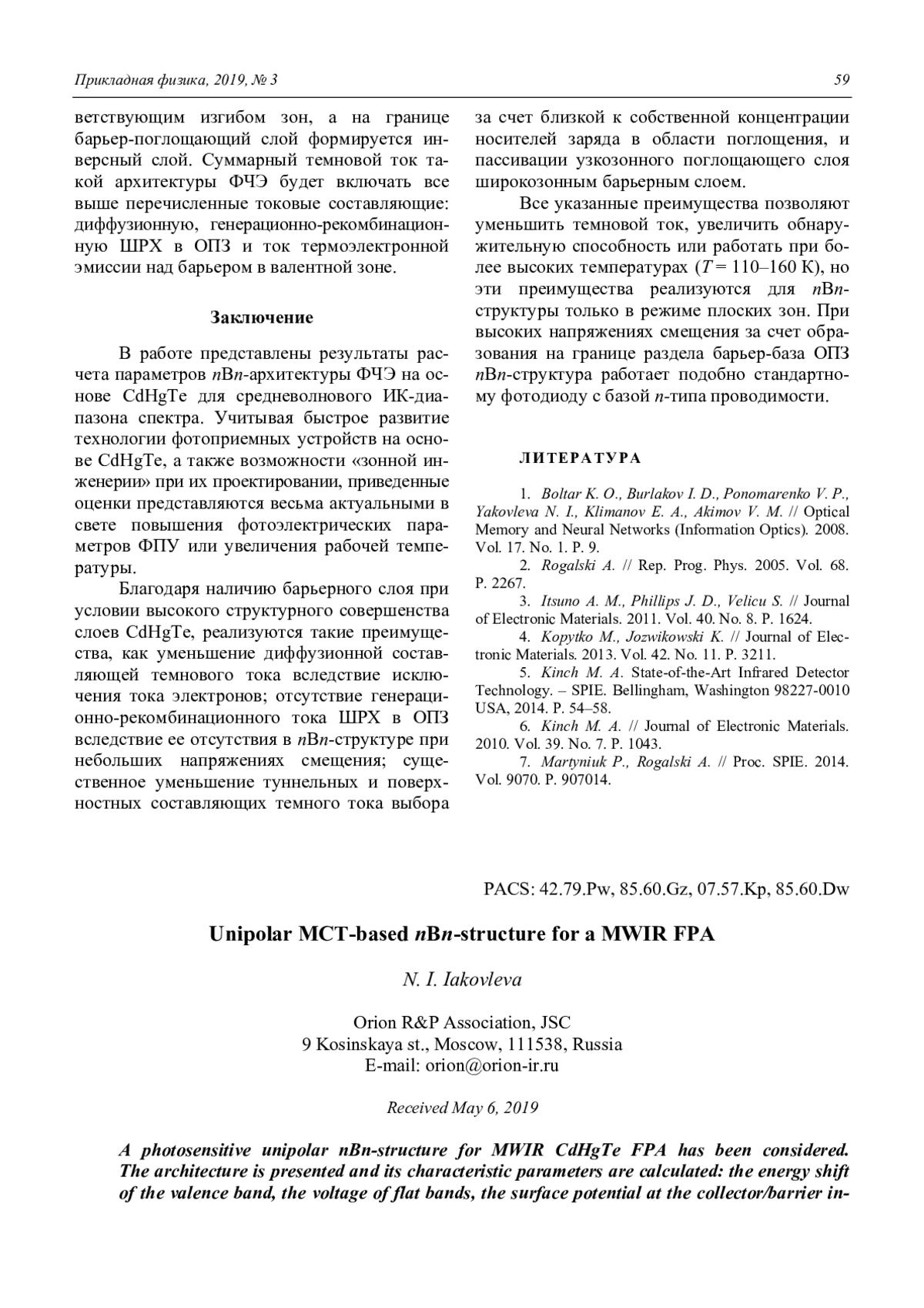 ЯКОВЛЕВА Н. УНИПОЛЯРНАЯ NBN-СТРУКТУРА НА ОСНОВЕ CDHGTE СРЕДНЕВОЛНОВОГО ИК-ДИАПАЗОНА СПЕКТРА // ПРИКЛАДНАЯ ФИЗИКА. 2019. №3