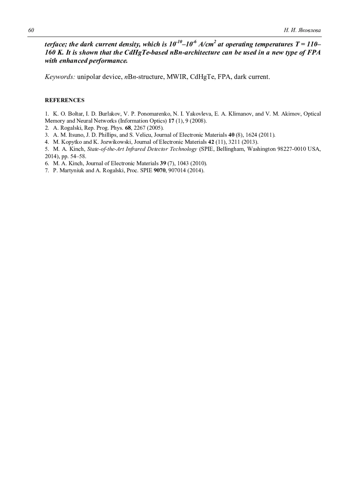 Ключевые фразы: униполярный прибор, nBn-структура, MWIR, CdHgTe, матрица фоточув- ствительных элементов, МФЧЭ, темновой ток