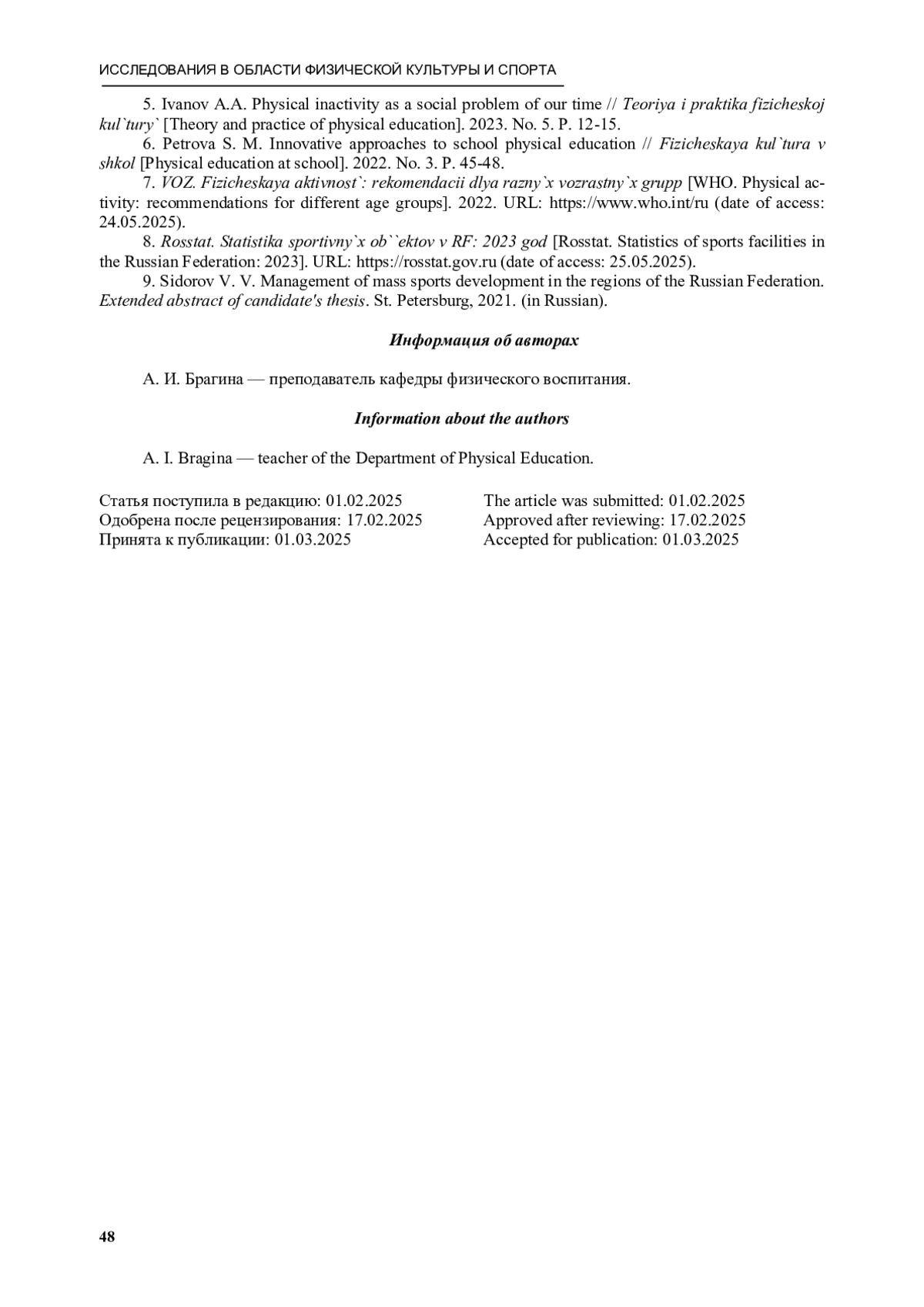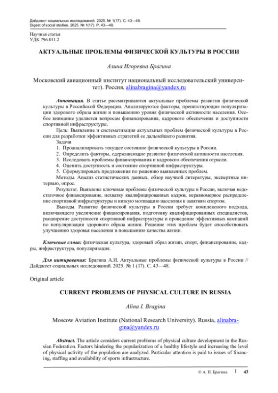 БРАГИНА А. И. АКТУАЛЬНЫЕ ПРОБЛЕМЫ ФИЗИЧЕСКОЙ КУЛЬТУРЫ В РОССИИ // ДАЙДЖЕСТ СОЦИАЛЬНЫХ ИССЛЕДОВАНИЙ. 2025. № 1 (17)