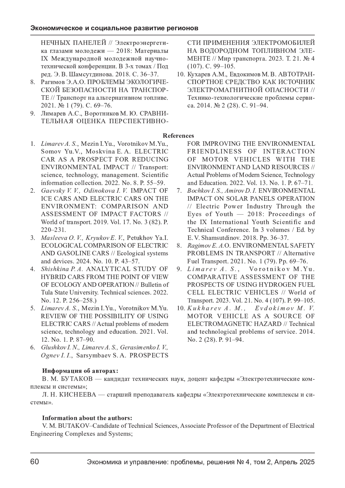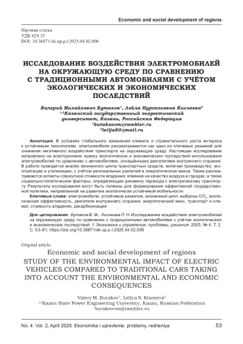 В условиях глобального изменения климата и стремительного роста интереса к устойчивым технологиям, электромобили рассматриваются как одно из ключевых решений для снижения негативного воздействия транспорта на окружающую среду. Настоящее исследование направлено на всестороннюю оценку экологических и экономических последствий использования электромобилей по сравнению с автомобилями, оснащёнными двигателями внутреннего сгорания. В работе проводится анализ жизненного цикла транспортных средств, включая производство, эксплуатацию и утилизацию, с учётом региональных различий в энергетическом миксе. Также рассматриваются аспекты совокупной стоимости владения, влияние на качество воздуха в городах, а также социально - политические факторы, определяющие динамику перехода к электрическому транспорту. Результаты исследования могут быть полезны для формирования эффективной государственной политики, направленной на развитие экологически устойчивой мобильности.