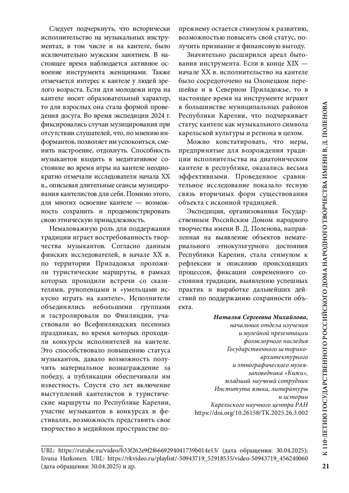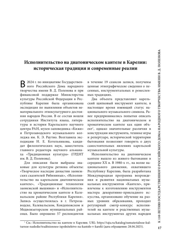 В 2024 г. по инициативе Государственного Российского Дома народного творчества имени В. Д. Поленова и при финансовой поддержке Министерства культуры Российской Федерации в Республике Карелия была организована экспедиция по выявлению объектов нематериального этнокультурного достояния народов России. В ее состав вошли сотрудники Института языка, литературы и истории Карельского научного центра РАН, музея-заповедника «Кижи» и Петрозаводского музыкального колледжа им. К. Э. Раутио. Возглавила экспедицию Н. Е. Котельникова, кандидат филологических наук, заместитель главного редактора научного альманаха «Традиционная культура» (ГРДНТ им. В. Д. Поленова).
