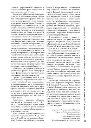 Сегодня, несомненно, велика роль методической службы — центров и домов народного творчества на уровне субъектов России, возглавляемой ГРДНТ им. В. Д. Поленова, — не имеющей мировых аналогов системы, успешно и плодотворно работающей в нашей стране более столетия.