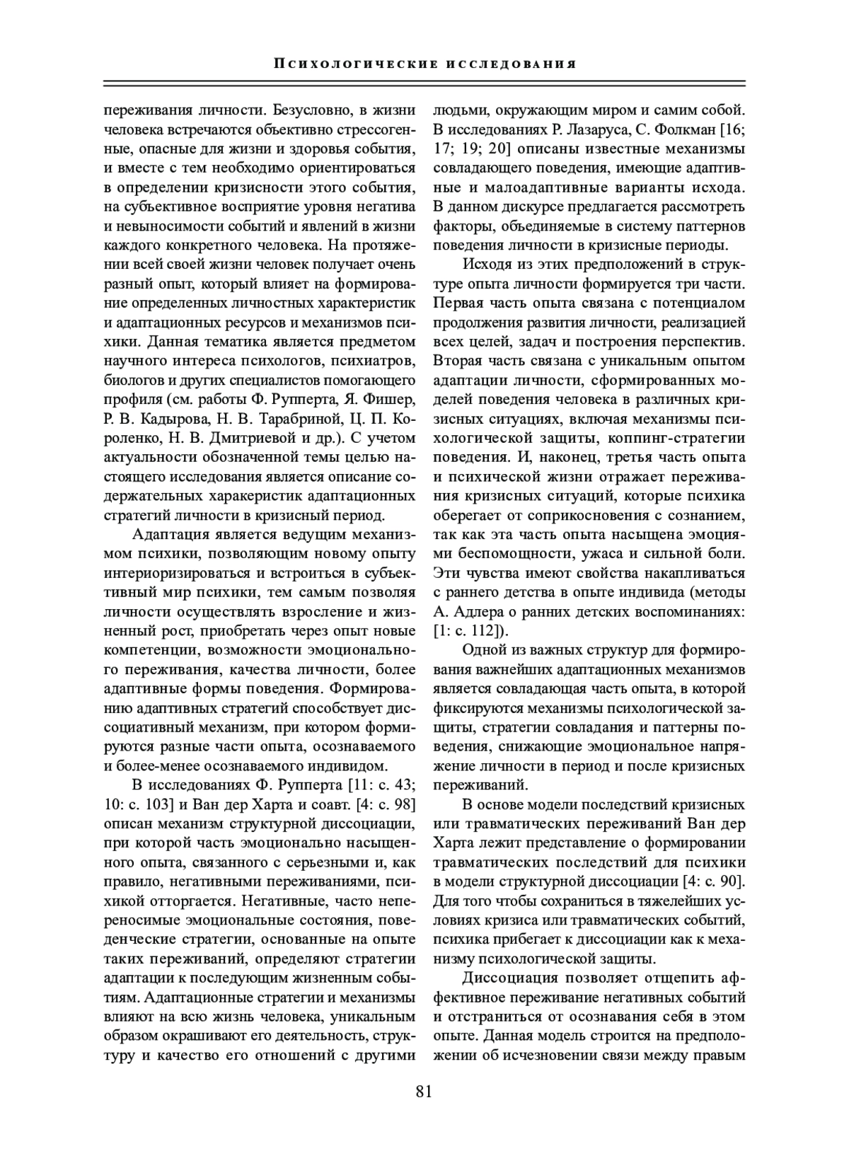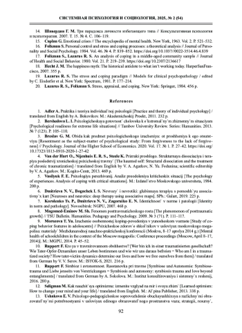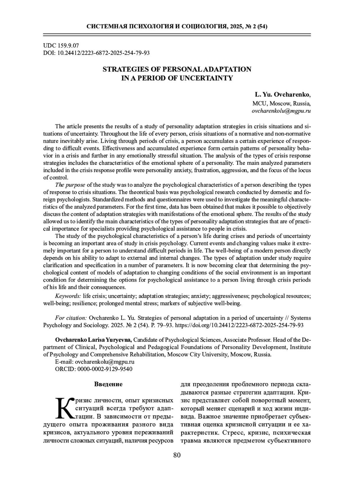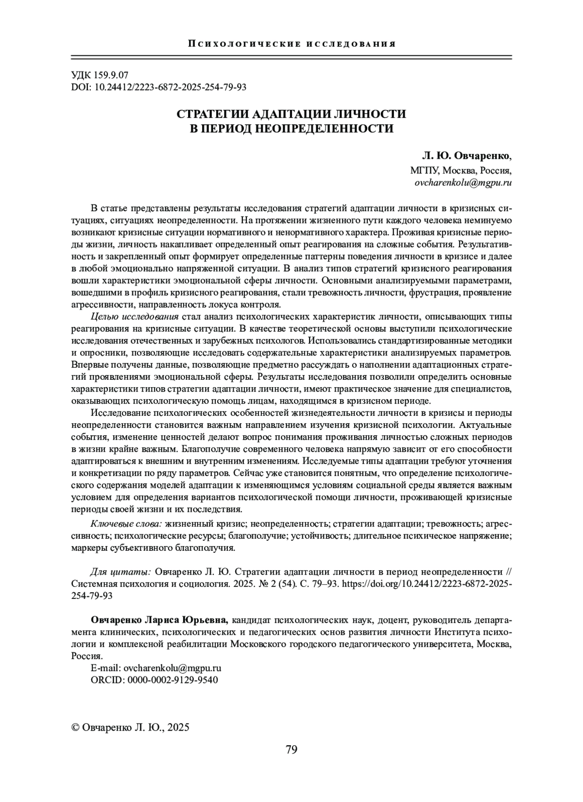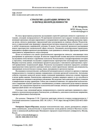 ОВЧАРЕНКО Л. Ю. СТРАТЕГИИ АДАПТАЦИИ ЛИЧНОСТИ В ПЕРИОД НЕОПРЕДЕЛЕННОСТИ // СИСТЕМНАЯ ПСИХОЛОГИЯ И СОЦИОЛОГИЯ. 2025. № 2 (54)