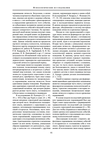 Целью исследования стал анализ психологических характеристик личности, описывающих типы реагирования на кризисные ситуации. В качестве теоретической основы выступили психологические исследования отечественных и зарубежных психологов. Использовались стандартизированные методики и опросники, позволяющие исследовать содержательные характеристики анализируемых параметров. Впервые получены данные, позволяющие предметно рассуждать о наполнении адаптационных стратегий проявлениями эмоциональной сферы. Результаты исследования позволили определить основные характеристики типов стратегии адаптации личности, имеют практическое значение для специалистов, оказывающих психологическую помощь лицам, находящимся в кризисном периоде.