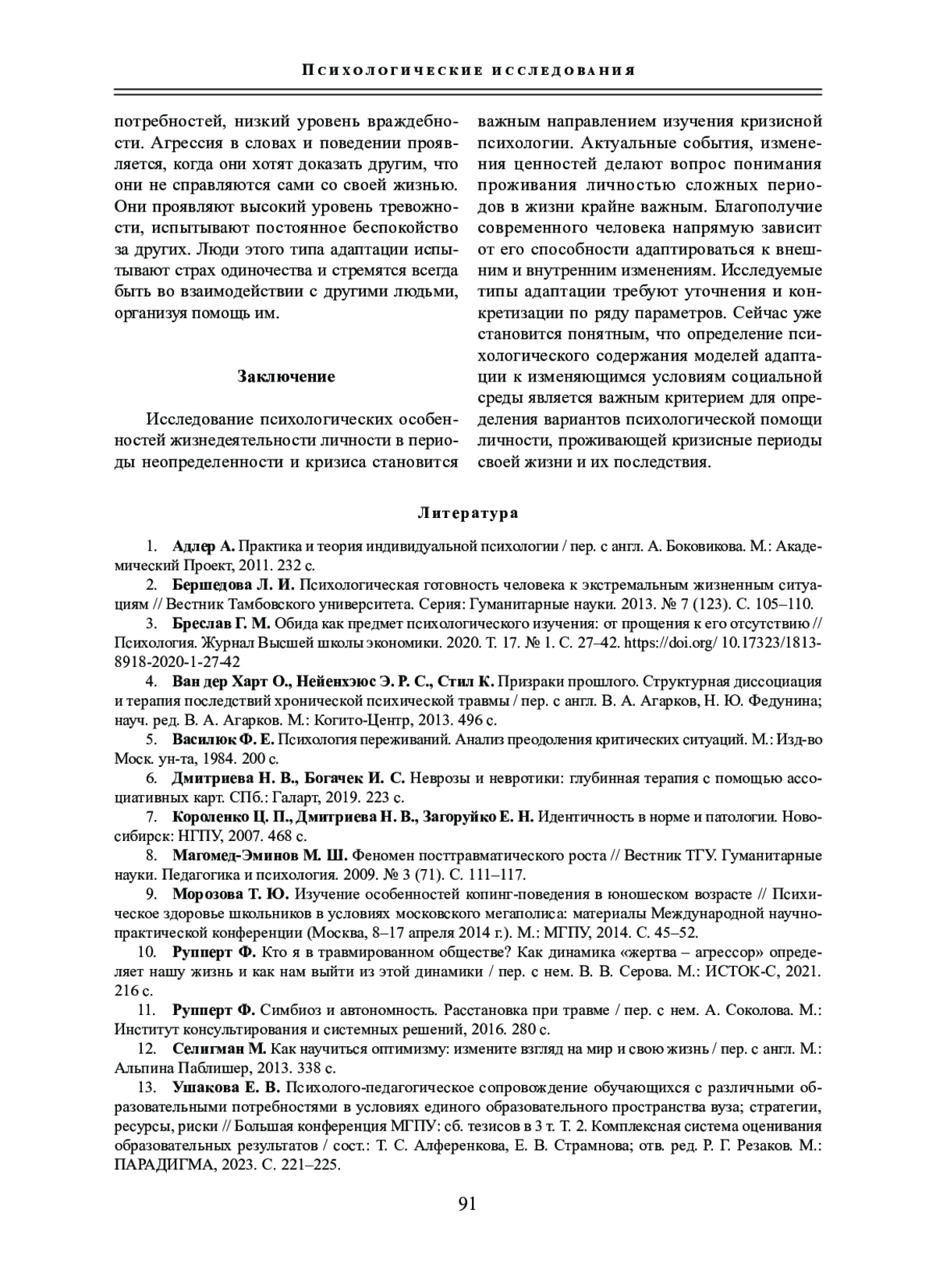 Исследование психологических особенностей жизнедеятельности личности в кризисы и периоды неопределенности становится важным направлением изучения кризисной психологии. Актуальные события, изменение ценностей делают вопрос понимания проживания личностью сложных периодов в жизни крайне важным. Благополучие современного человека напрямую зависит от его способности адаптироваться к внешним и внутренним изменениям. Исследуемые типы адаптации требуют уточнения и конкретизации по ряду параметров. Сейчас уже становится понятным, что определение психологического содержания моделей адаптации к изменяющимся условиям социальной среды является важным условием для определения вариантов психологической помощи личности, проживающей кризисные периоды своей жизни и их последствия.
