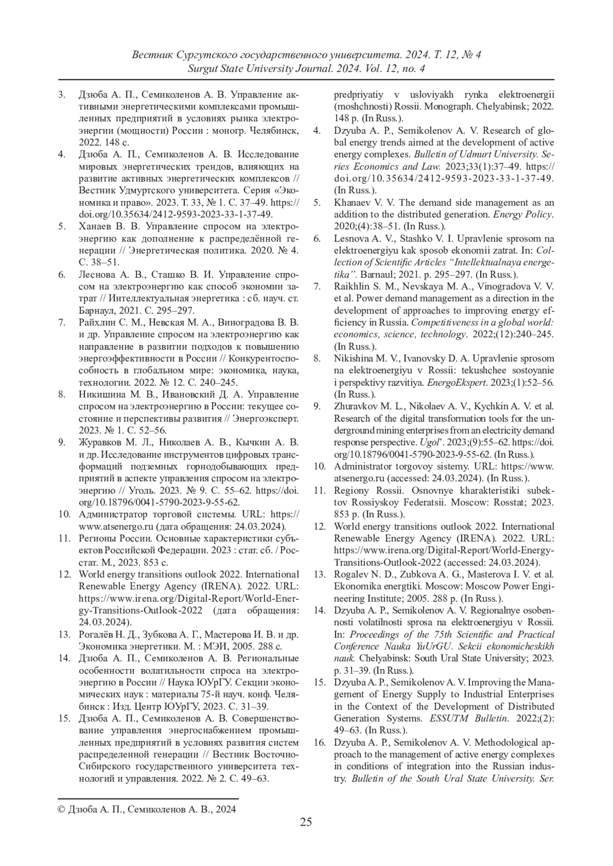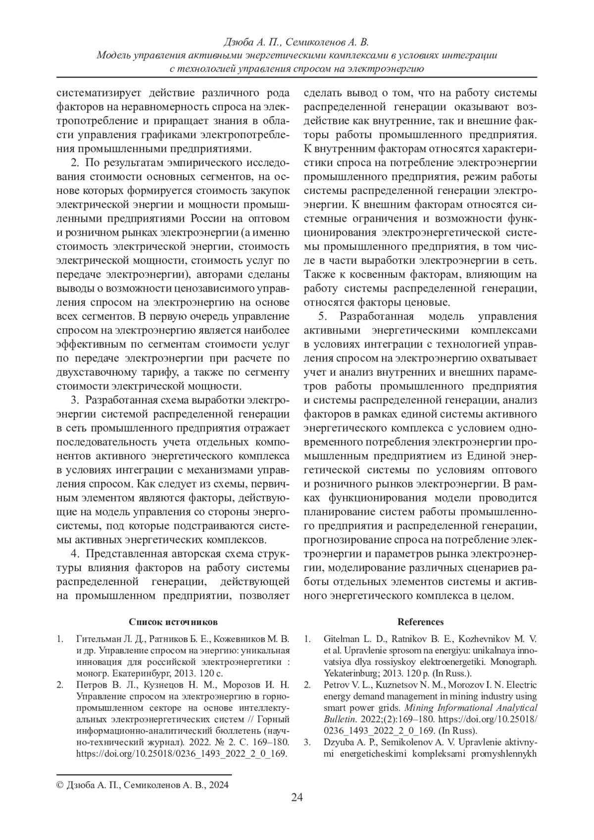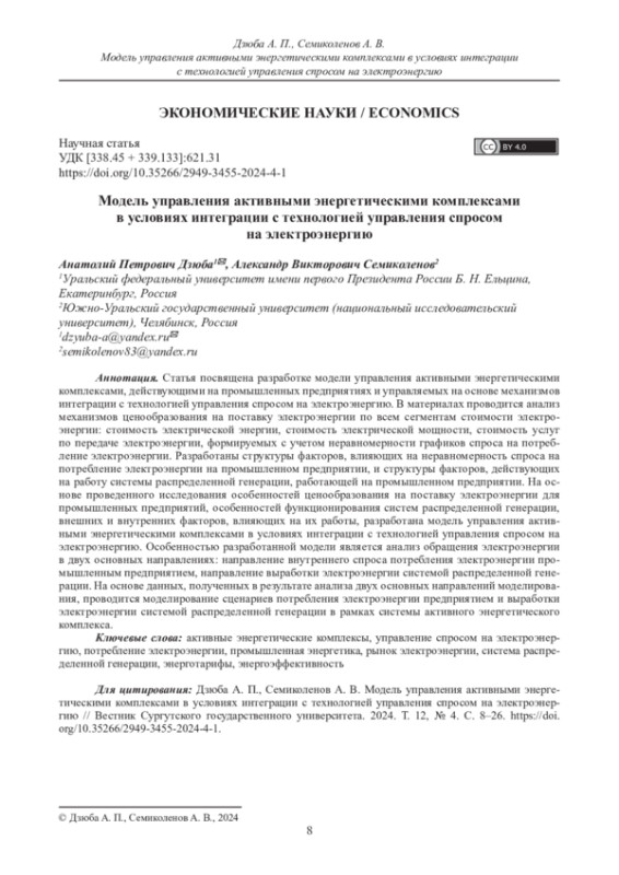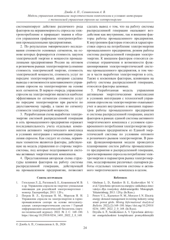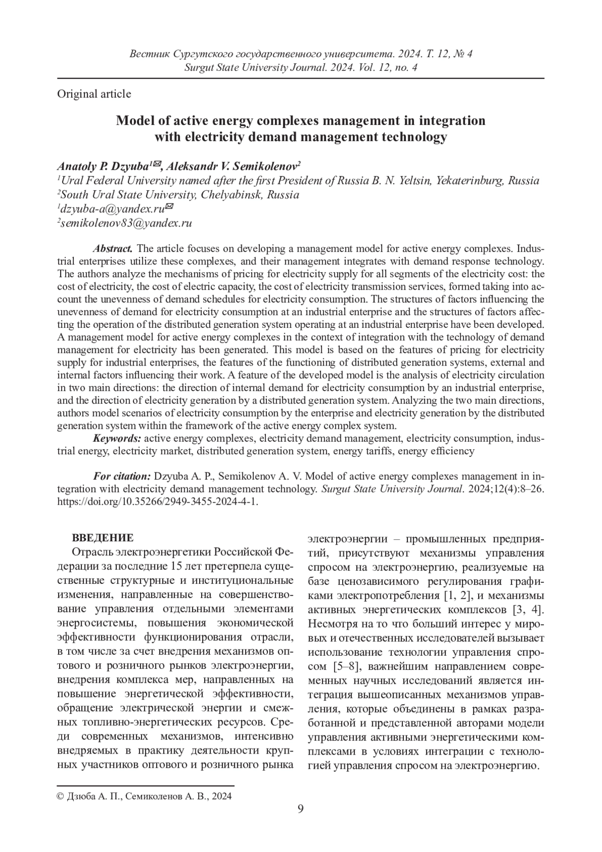 Статья посвящена разработке модели управления активными энергетическими комплексами, действующими на промышленных предприятиях и управляемых на основе механизмов интеграции с технологией управления спросом на электроэнергию. В материалах проводится анализ механизмов ценообразования на поставку электроэнергии по всем сегментам стоимости электроэнергии: стоимость электрической энергии, стоимость электрической мощности, стоимость услуг по передаче электроэнергии, формируемых с учетом неравномерности графиков спроса на потребление электроэнергии. Разработаны структуры факторов, влияющих на неравномерность спроса на потребление электроэнергии на промышленном предприятии, и структуры факторов, действующих на работу системы распределенной генерации, работающей на промышленном предприятии. На основе проведенного исследования особенностей ценообразования на поставку электроэнергии для промышленных предприятий, особенностей функционирования систем распределенной генерации, внешних и внутренних факторов, влияющих на их работы, разработана модель управления активными энергетическими комплексами в условиях интеграции с технологией управления спросом на электроэнергию. Особенностью разработанной модели является анализ обращения электроэнергии в двух основных направлениях: направление внутреннего спроса потребления электроэнергии промышленным предприятием, направление выработки электроэнергии системой распределенной генерации. На основе данных, полученных в результате анализа двух основных направлений моделирования, проводится моделирование сценариев потребления электроэнергии предприятием и выработки электроэнергии системой распределенной генерации в рамках системы активного энергетического комплекса.