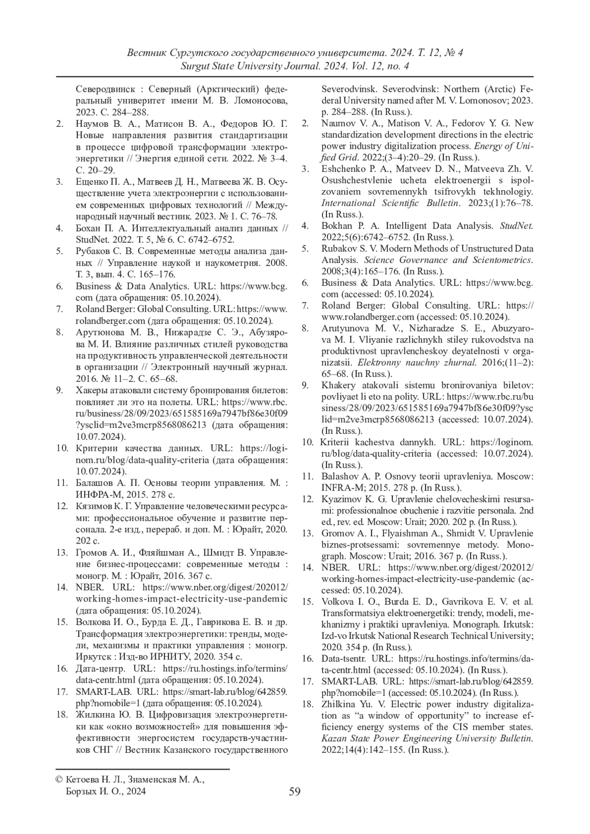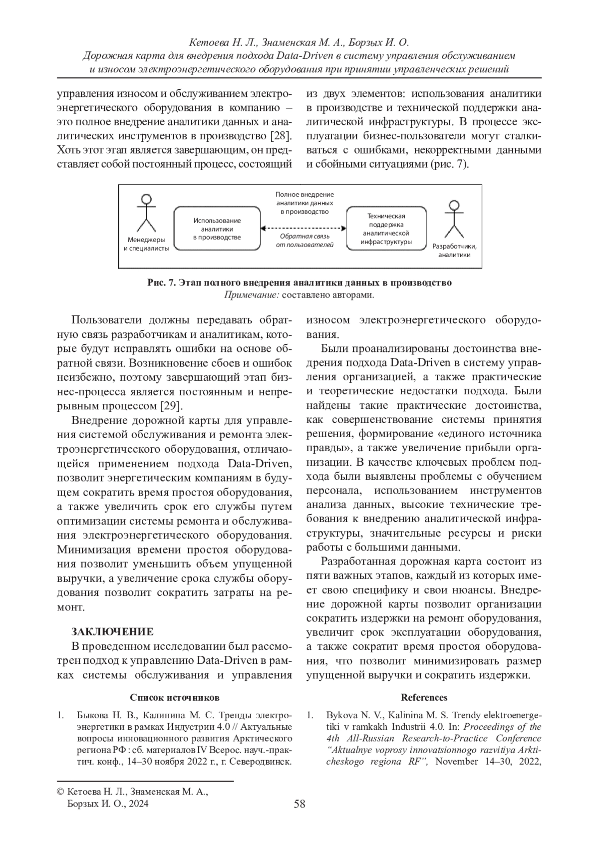 Целью исследования является формирование дорожной карты для внедрения подхода Data-Driven в систему управления обслуживанием и износом электроэнергетического оборудования при принятии управленческих решений в электроэнергетической компании. Предмет исследования – подход Data-Driven в системе управления обслуживанием и износом электроэнергетического оборудования. Методологическую базу исследования составили материалы и методы: диалектический, научного познания и частные научные (анализ, синтез, сравнение, логический и системно-структурный анализ, формализация, анализ нормативно-правовых документов), моделирование. Результаты исследования помогут предприятиям электроэнергетической отрасли внедрять подход к управлению Data-Driven в систему управления обслуживанием и ремонтом электроэнергетического оборудования с использованием представленной дорожной карты. Дорожная карта поможет предприятиям снизить потерю финансовых и материальных ресурсов, вызванную простоем и поломками оборудования.