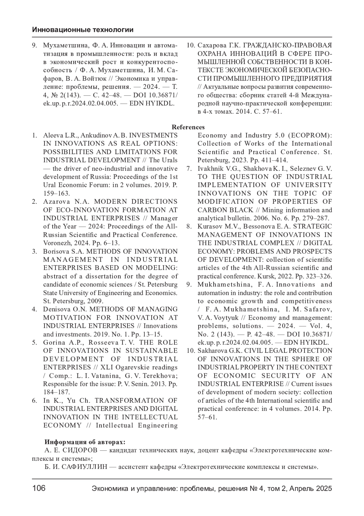 9. Мухаметшина, Ф. А. Инновации и автоматизация в промышленности: роль и вклад в экономический рост и конкурентоспо-собность / Ф. А. Мухаметшина, И. М. Сафаров, В. А. Войтюк// Экономика и управление: проблемы, решения. - 2024. - Т.4, № 2(143). - С. 42-48. DOI: 10.36871/ek.up.p.r.2024.02.04.005 EDN: HYIKDL