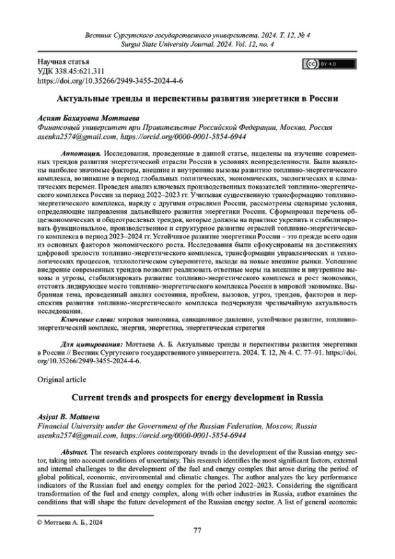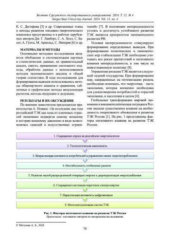 Исследования, проведенные в данной статье, нацелены на изучение современных трендов развития энергетической отрасли России в условиях неопределенности. Были выявлены наиболее значимые факторы, внешние и внутренние вызовы развитию топливно-энергетического комплекса, возникшие в период глобальных политических, экономических, экологических и климатических перемен. Проведен анализ ключевых производственных показателей топливно-энергетического комплекса России за период 2022–2023 гг. Учитывая существенную трансформацию топливно-энергетического комплекса, наряду с другими отраслями России, рассмотрены сценарные условия, определяющие направления дальнейшего развития энергетики России. Сформирован перечень общеэкономических и общеотраслевых трендов, которые должны на практике укрепить и стабилизировать функциональное, производственное и структурное развитие отраслей топливно-энергетического комплекса в период 2023–2024 гг. Устойчивое развитие энергетики России – это прежде всего один из основных факторов экономического роста. Исследования были сфокусированы на достижениях цифровой зрелости топливно-энергетического комплекса, трансформации управленческих и технологических процессов, технологическом суверенитете, выходе на новые внешние рынки. Успешное внедрение современных трендов позволит реализовать ответные меры на внешние и внутренние вызовы и угрозы, стабилизировать развитие топливно-энергетического комплекса и рост экономики, отстоять лидирующее место топливно-энергетического комплекса России в мировой экономике. Выбранная тема, проведенный анализ состояния, проблем, вызовов, угроз, трендов, факторов и перспектив развития топливно-энергетического комплекса подчеркнули чрезвычайную актуальность исследования.