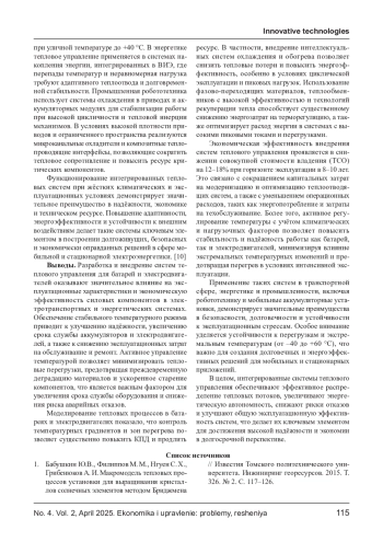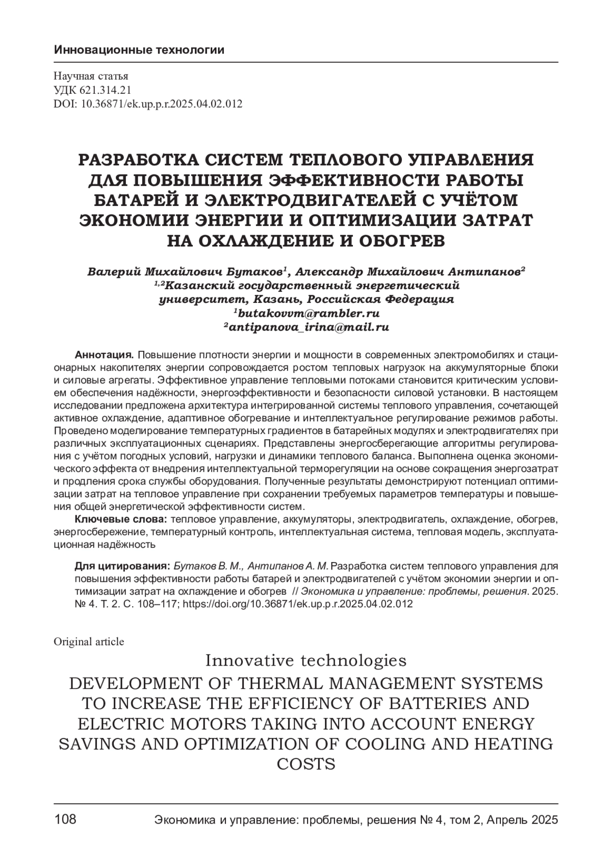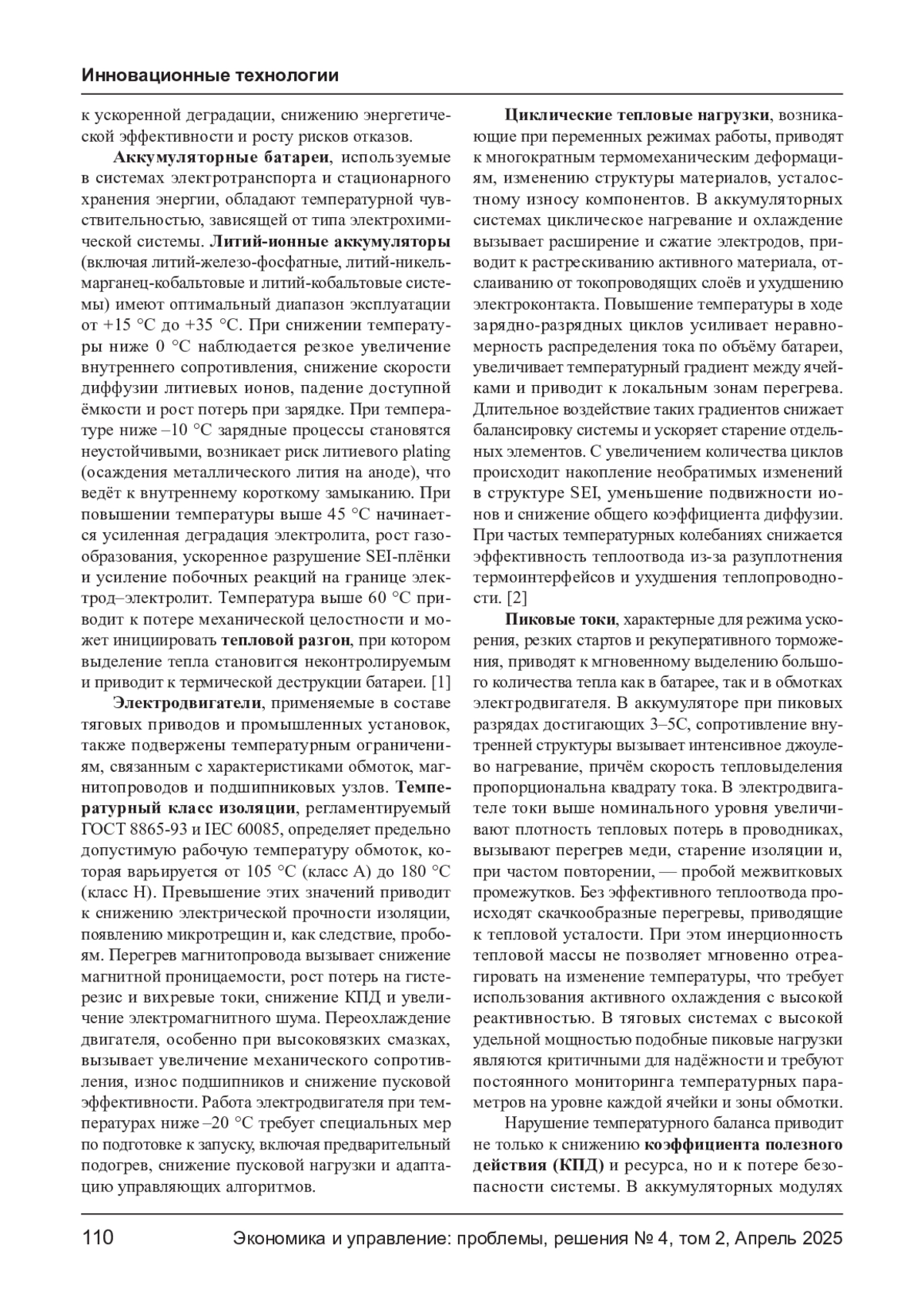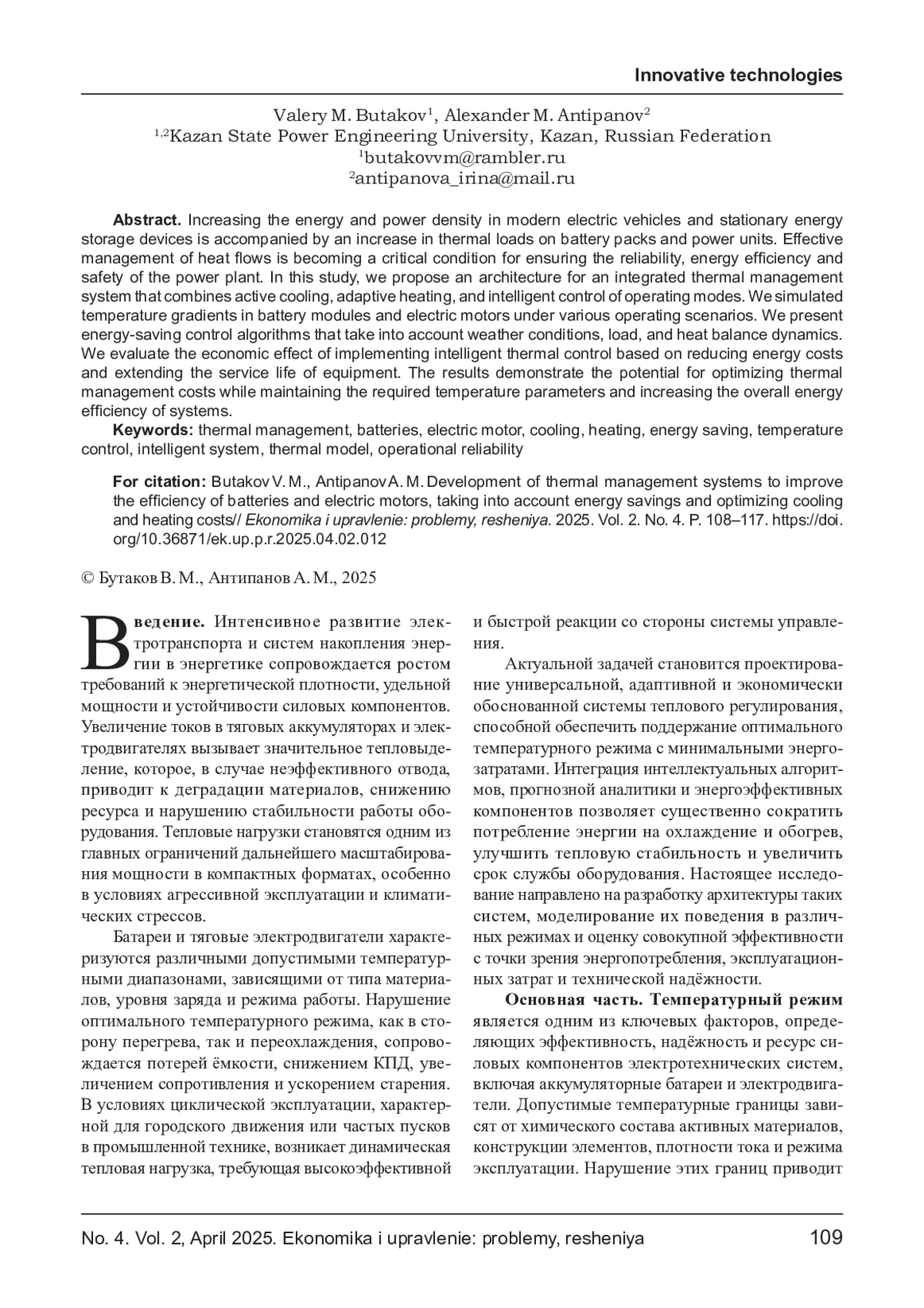Повышение плотности энергии и мощности в современных электромобилях и стационарных накопителях энергии сопровождается ростом тепловых нагрузок на аккумуляторные блоки и силовые агрегаты. Эффективное управление тепловыми потоками становится критическим условием обеспечения надёжности, энергоэффективности и безопасности силовой установки. В настоящем исследовании предложена архитектура интегрированной системы теплового управления, сочетающей активное охлаждение, адаптивное обогревание и интеллектуальное регулирование режимов работы. Проведено моделирование температурных градиентов в батарейных модулях и электродвигателях при различных эксплуатационных сценариях. Представлены энергосберегающие алгоритмы регулирования с учётом погодных условий, нагрузки и динамики теплового баланса. Выполнена оценка экономического эффекта от внедрения интеллектуальной терморегуляции на основе сокращения энергозатрат и продления срока службы оборудования. Полученные результаты демонстрируют потенциал оптимизации затрат на тепловое управление при сохранении требуемых параметров температуры и повышения общей энергетической эффективности систем.