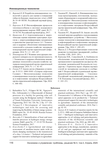 7. Хасанов Р.Г., Павлов Н. А. Инновационные подходы проектирования, изготовления, эксплуатации оборудования и сооружений нефтегазового профиля // Интеллектуальные технологии и инновационные подходы в нефтепереработке и нефтехимии: материалы Всероссийской научно- практической конференции. Уфа, 2024. С. 433-434. EDN: ZRMZZM