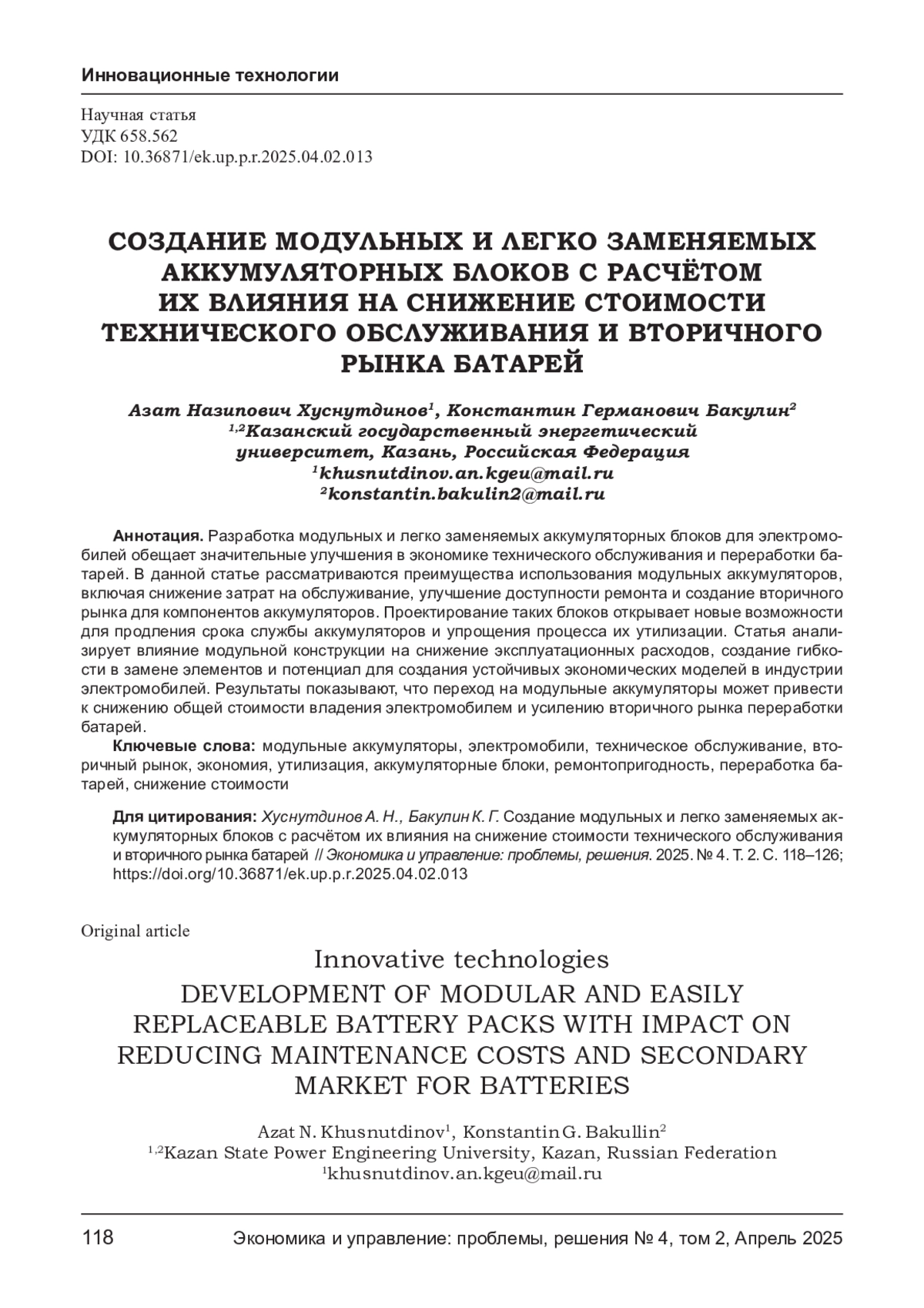 Разработка модульных и легко заменяемых аккумуляторных блоков для электромобилей обещает значительные улучшения в экономике технического обслуживания и переработки батарей. В данной статье рассматриваются преимущества использования модульных аккумуляторов, включая снижение затрат на обслуживание, улучшение доступности ремонта и создание вторичного рынка для компонентов аккумуляторов. Проектирование таких блоков открывает новые возможности для продления срока службы аккумуляторов и упрощения процесса их утилизации. Статья анализирует влияние модульной конструкции на снижение эксплуатационных расходов, создание гибкости в замене элементов и потенциал для создания устойчивых экономических моделей в индустрии электромобилей. Результаты показывают, что переход на модульные аккумуляторы может привести к снижению общей стоимости владения электромобилем и усилению вторичного рынка переработки батарей.