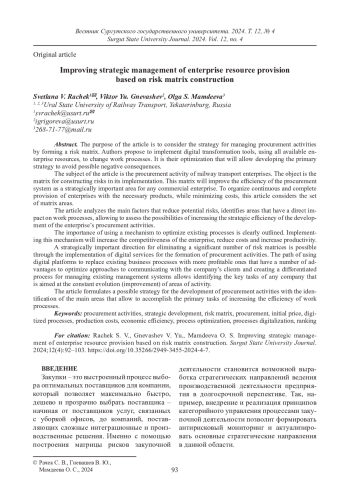 Предметом статьи является закупочная деятельность предприятий железнодорожного транспорта, объектом – матрица построения рисков при ее осуществлении. Данная матрица позволит повысить эффективность функционирования системы закупочной деятельности как стратегически важного направления для любого коммерческого предприятия. Совокупность направлений матрицы рассмотрена в статье в целях организации бесперебойного и комплектного обеспечения предприятий необходимой продукцией с учетом минимальных издержек.