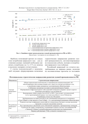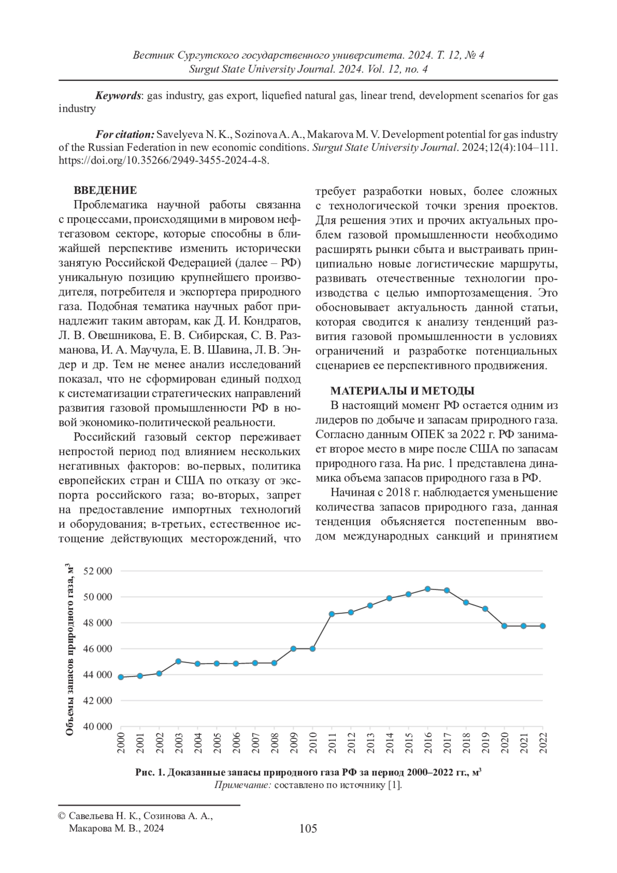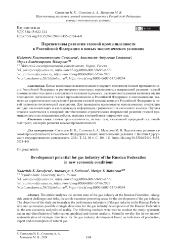 Аннотация. Целью исследования является анализ текущего положения газовой промышленности Российской Федерации и рассмотрение некоторых перспективных направлений развития газовой промышленности в связи с актуальными вызовами и рисками. Задачами исследования являются анализ показателей деятельности газовой промышленности в Российской Федерации и систематизация возможных стратегических направлений развития газовой промышленности Российской Федерации в новой экономико-политической реальности. Для проведения исследования использовались следующие методы: систематизации и классификации информации, графического и системного анализа. Научная новизна заключается в авторской систематизации стратегических направлений развития газовой промышленности по показателям добычи, экспорта и потребления природного газа.