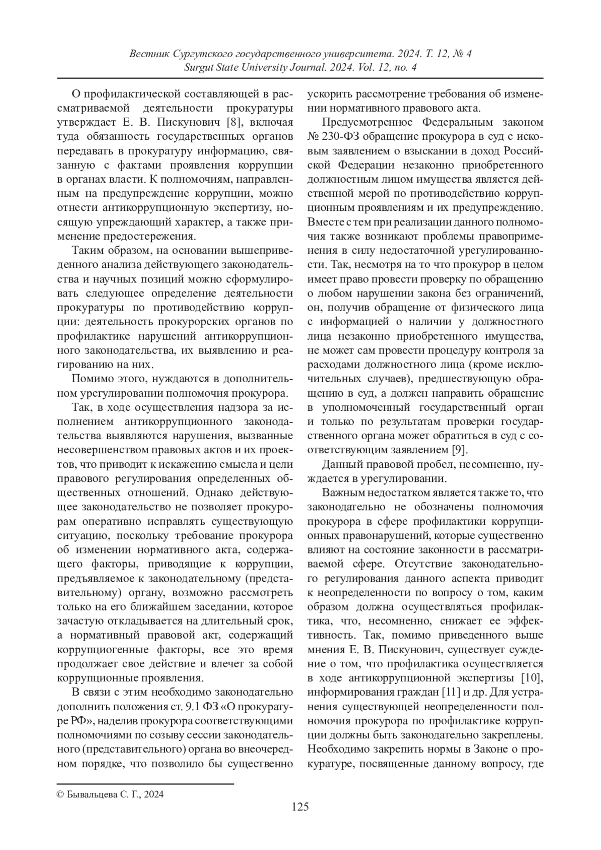8. Пискунович Е. В. Формы и методы работы органов прокуратуры по противодействию коррупции в органах власти и управления // Вестник Новгородского филиала РАНХиГС. 2016. Т. 5, № 2-2. С. 183-188.
