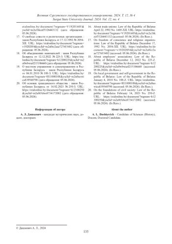 11. Дашкевіч А. Л. Грамадскія аб’яднанні як суб’екты канстытуцыйна-прававых адносін у Рэспубліцы Беларусь // Право и демократия : сб. науч. тр. Минск, 2010. Вып. 21. URL: https://elib.bsu.by/bitstream/123456789/15249/1/3_дашкевич.pdf (дата обращения: 05.06.2024).