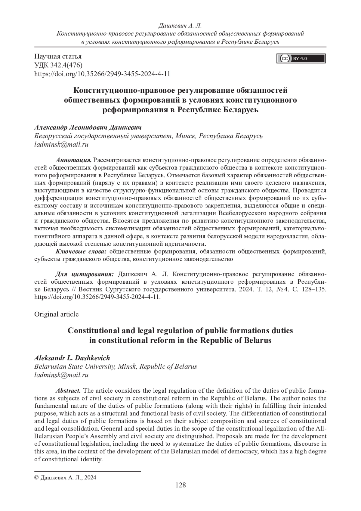 8. Дашкевіч А. Л. Выкарыстанне паняцця грамадскага фарміравання ў канстытуцыйна-прававым рэгуляванні ў Рэспубліцы Беларусь // Сацыяльна-эканамічныя і прававыя даследаванні. 2021. № 2. С. 4-12.