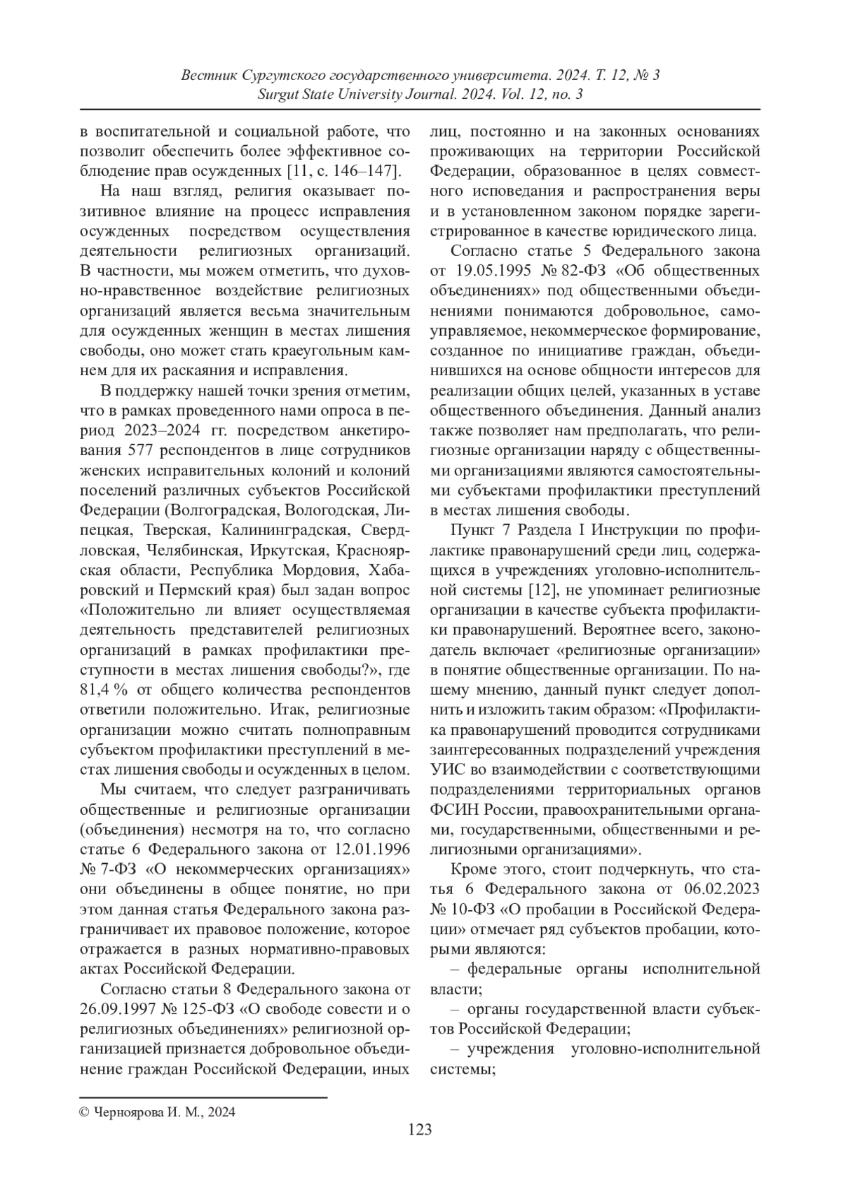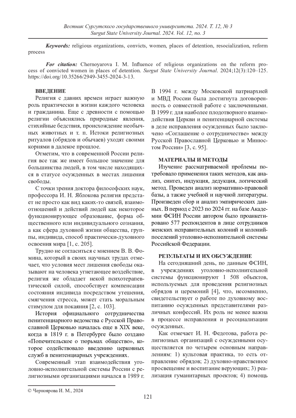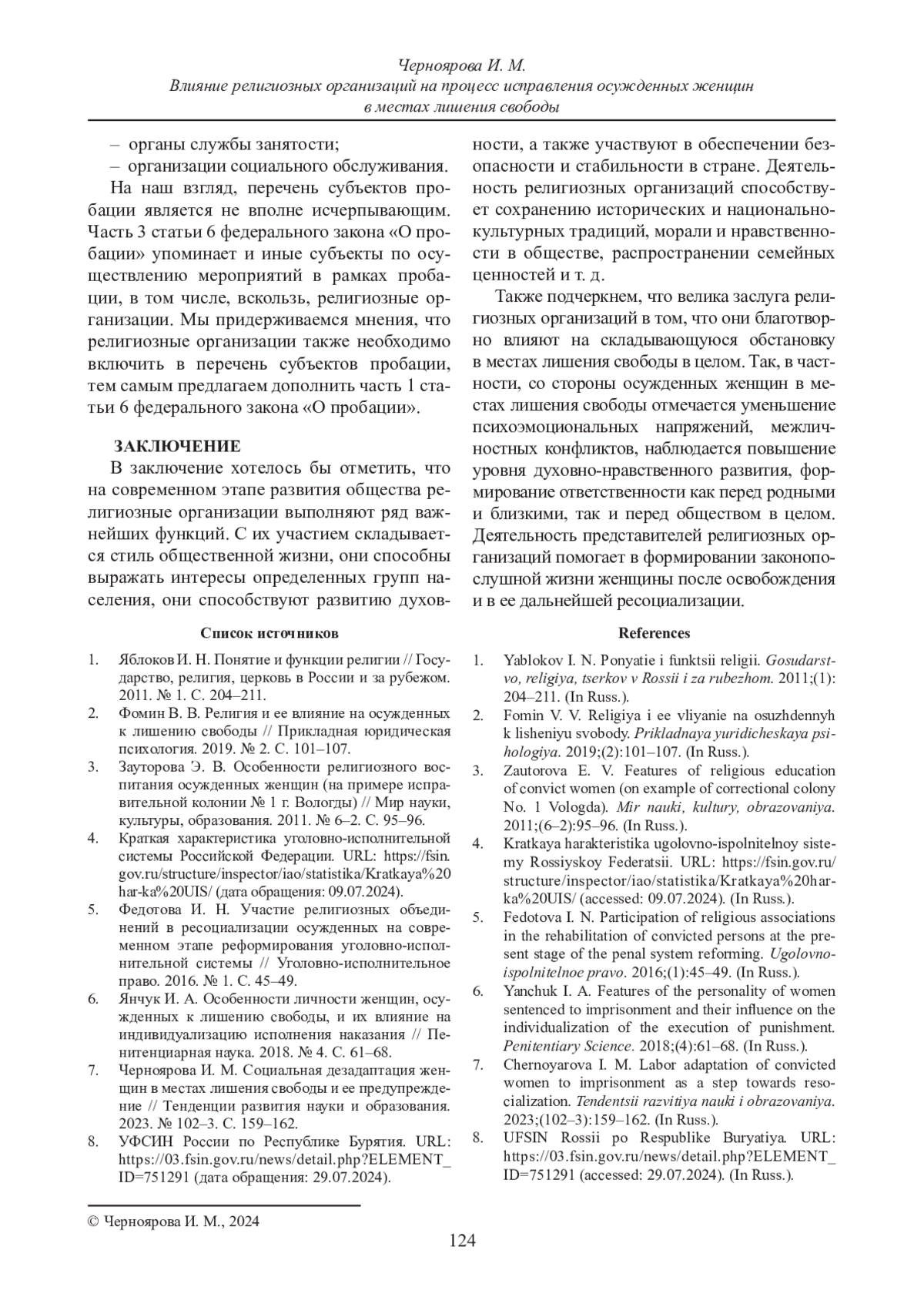 5. Федотова И. Н. Участие религиозных объединений в ресоциализации осужденных на современном этапе реформирования уголовно-исполнительной системы // Уголовно-исполнительное право. 2016. № 1. С. 45-49.