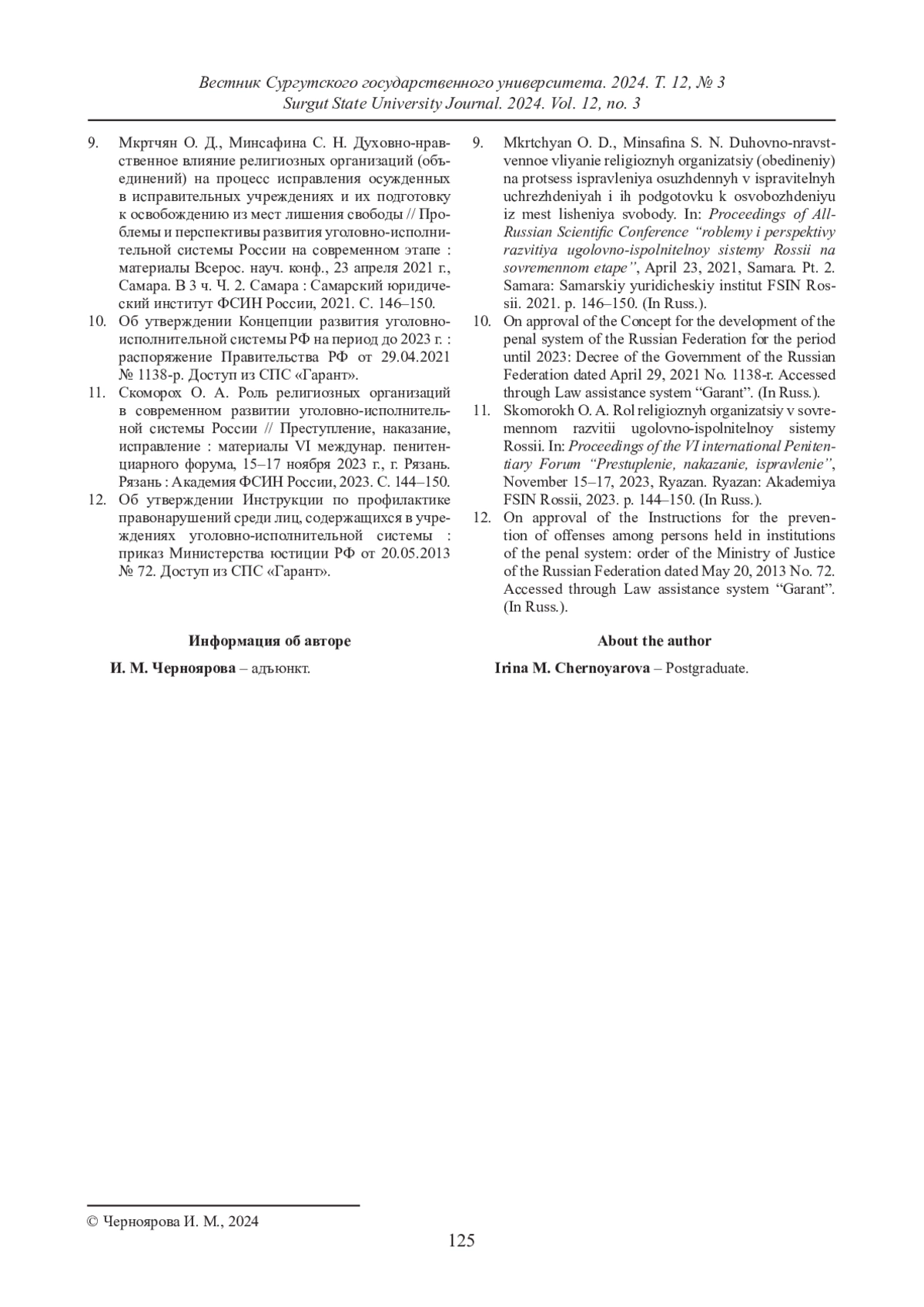 9. Мкртчян О. Д., Минсафина С. Н. Духовно-нравственное влияние религиозных организаций (объединений) на процесс исправления осужденных в исправительных учреждениях и их подготовку к освобождению из мест лишения свободы // Проблемы и перспективы развития уголовно-исполнительной системы России на современном этапе : материалы Всерос. науч. конф., 23 апреля 2021 г., Самара. В 3 ч. Ч. 2. Самара : Самарский юридический институт ФСИН России, 2021. С. 146-150.