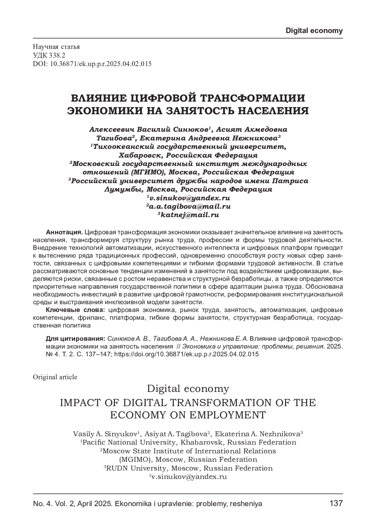 Цифровая трансформация экономики оказывает многоплановое влияние на занятость, изменяя структуру рынка труда, формы трудовых отношений и квалификационные требования к работникам. Активное внедрение технологий автоматизации, искусственного интеллекта и цифровых платформ приводит к вытеснению рутинных профессий и одновременно стимулирует рост новых сфер занятости, связанных с ИТ, анализом данных и цифровыми сервисами. В статье анализируются ключевые тенденции, связанные с трансформацией занятости в условиях цифровизации, включая риски роста неравенства, проблемы адаптации работников и необходимость модернизации государственной политики в сфере трудовых отношений. Обосновано, что долгосрочная устойчивость занятости в цифровой экономике требует системных инвестиций в развитие цифровых компетенций и институциональных реформ, обеспечивающих гибкость и инклюзивность рынка труда.