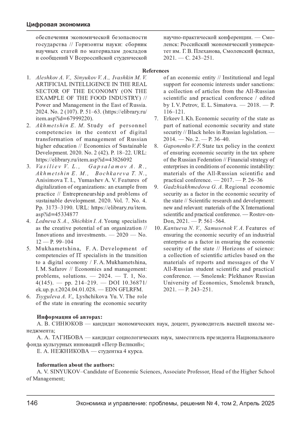 5. Мухаметшина, Ф. А. Развитие компетенций ИТ-специалистов в условиях перехода к цифровой экономике / Ф. А. Мухаметшина, И. М. Сафаров // Экономика и управление: проблемы, решения. - 2024. - Т. 1, № 4(145). - С. 214-219. DOI: 10.36871/ek.up.p.r.2024.04.01.028 EDN: GFLRFM