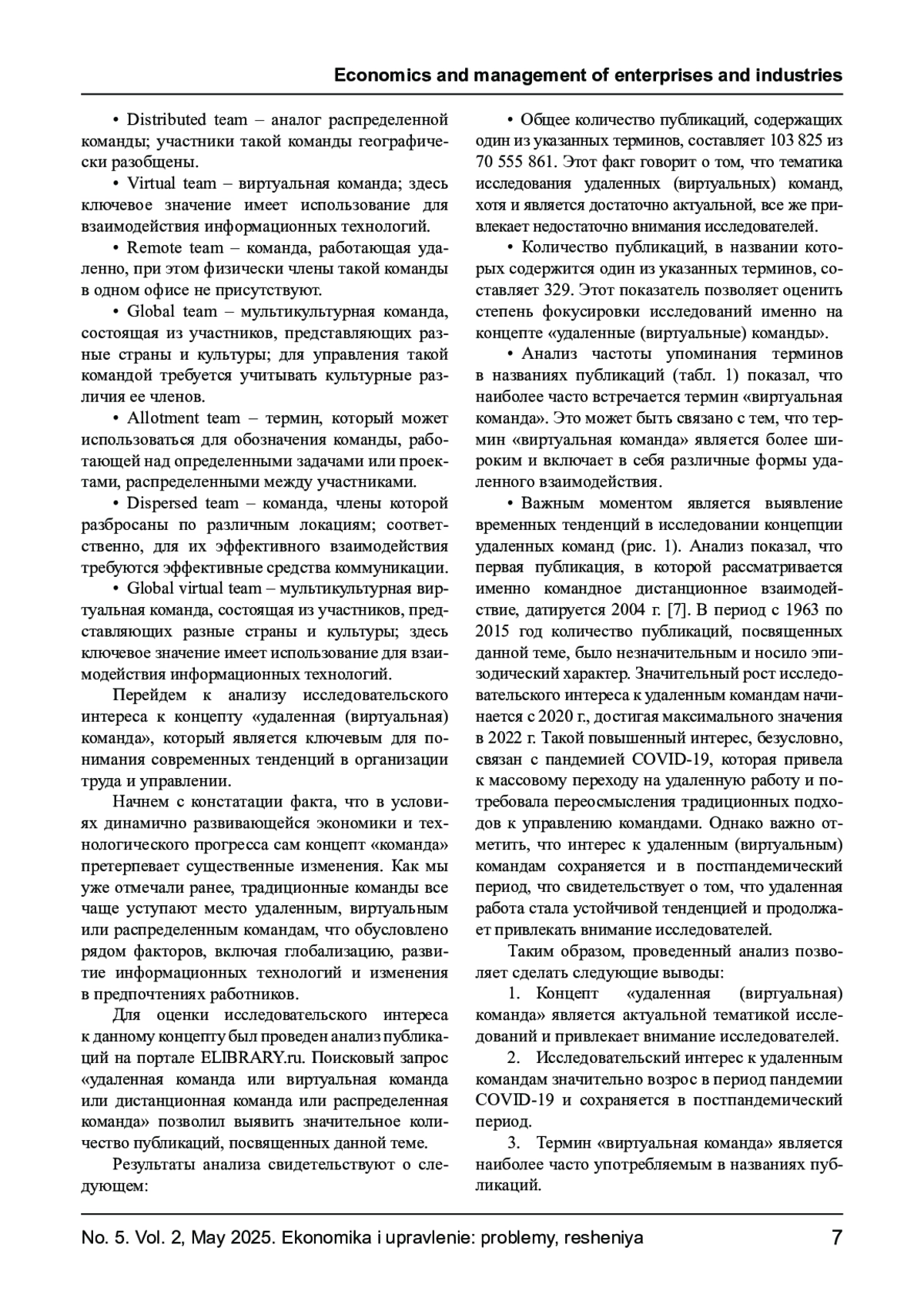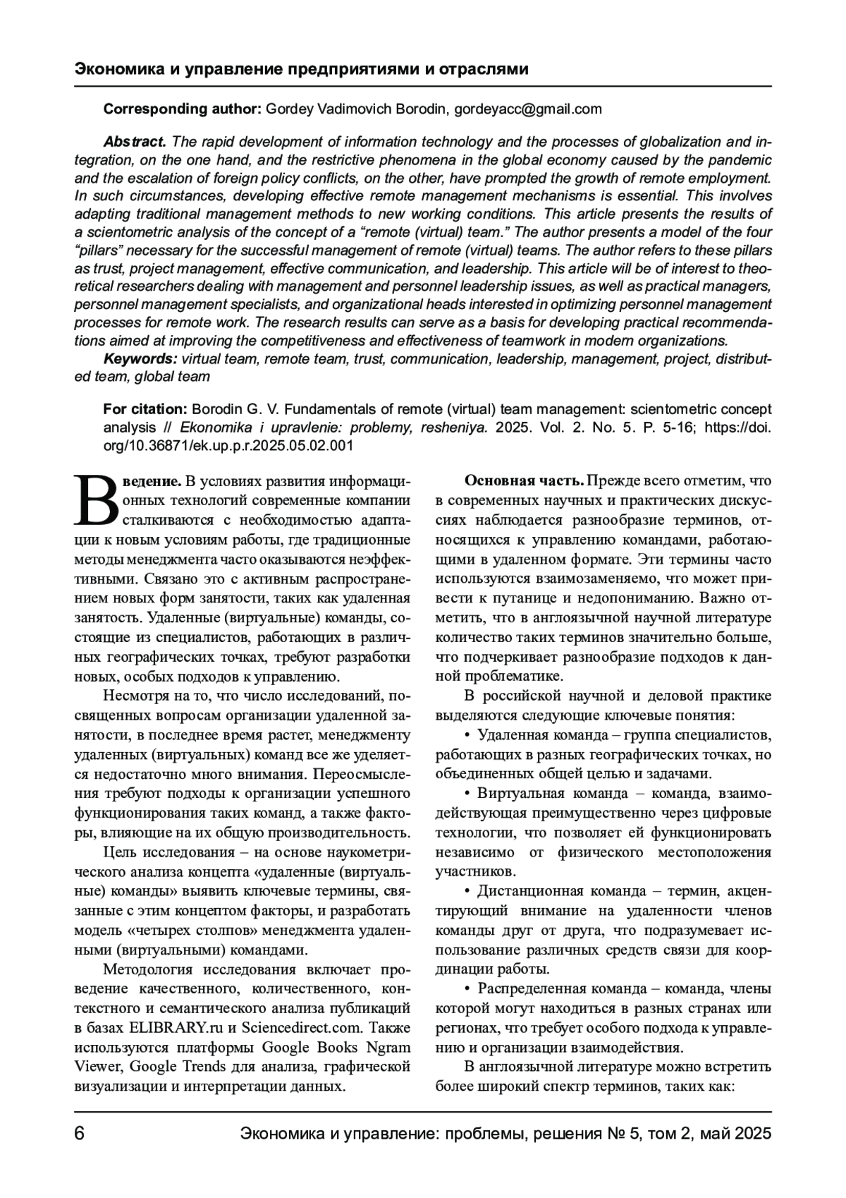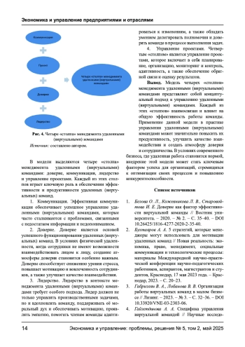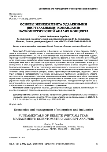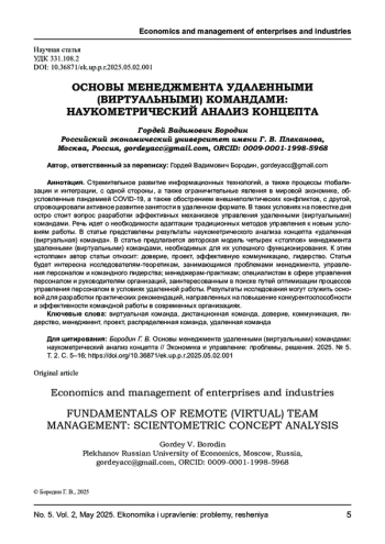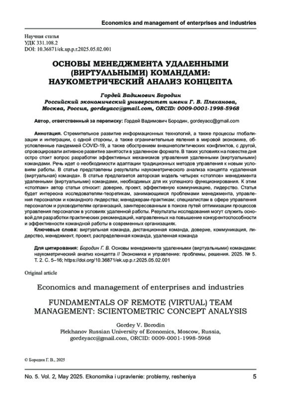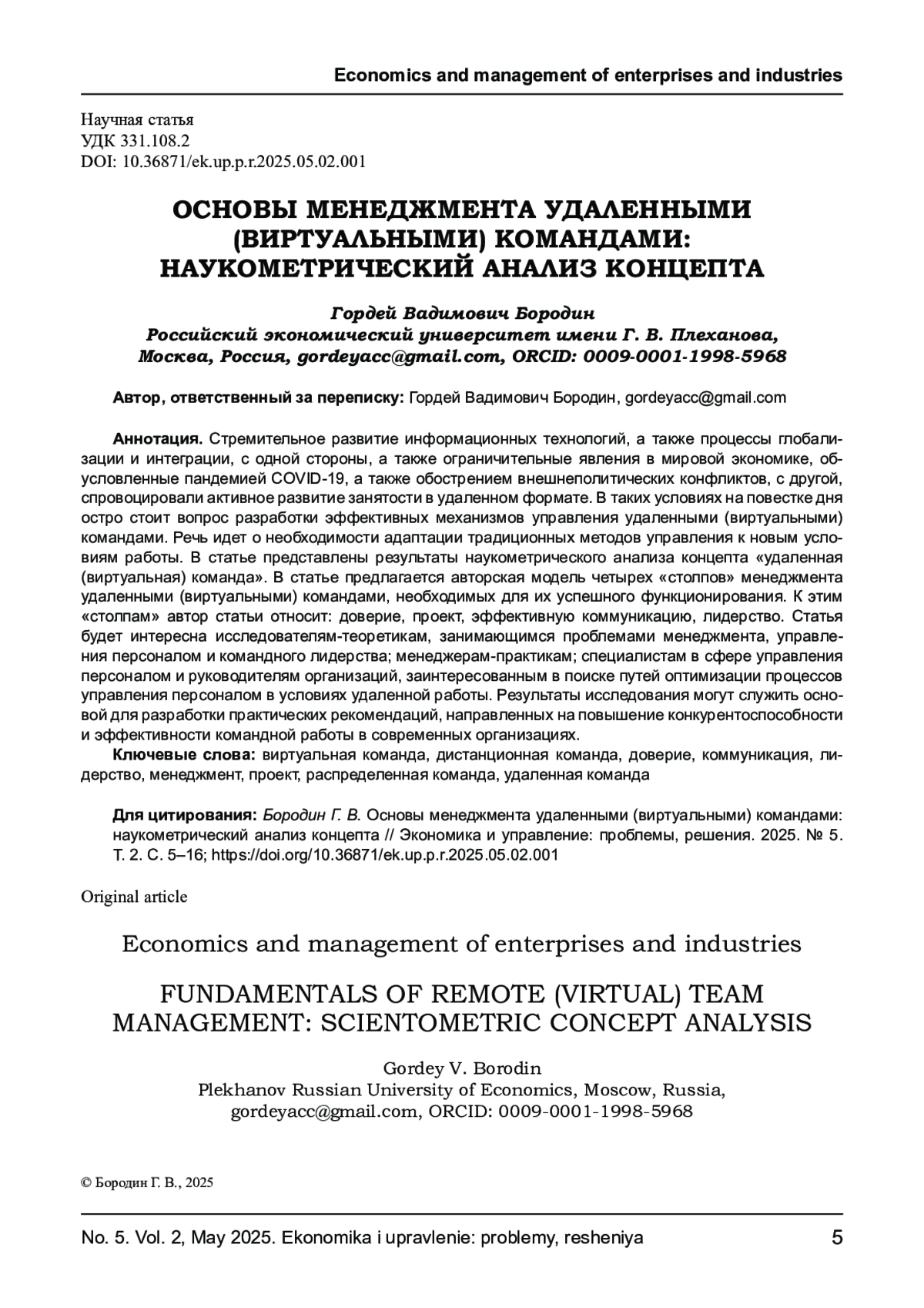 Стремительное развитие информационных технологий, а также процессы глобализации и интеграции, с одной стороны, а также ограничительные явления в мировой экономике, обусловленные пандемией COVID-19, а также обострением внешнеполитических конфликтов, с другой, спровоцировали активное развитие занятости в удаленном формате. В таких условиях на повестке дня остро стоит вопрос разработки эффективных механизмов управления удаленными (виртуальными) командами. Речь идет о необходимости адаптации традиционных методов управления к новым условиям работы. В статье представлены результаты наукометрического анализа концепта «удаленная (виртуальная) команда». В статье предлагается авторская модель четырех «столпов» менеджмента удаленными (виртуальными) командами, необходимых для их успешного функционирования. К этим «столпам» автор статьи относит: доверие, проект, эффективную коммуникацию, лидерство. Статья будет интересна исследователям-теоретикам, занимающимся проблемами менеджмента, управления персоналом и командного лидерства; менеджерам-практикам; специалистам в сфере управления персоналом и руководителям организаций, заинтересованным в поиске путей оптимизации процессов управления персоналом в условиях удаленной работы. Результаты исследования могут служить основой для разработки практических рекомендаций, направленных на повышение конкурентоспособности и эффективности командной работы в современных организациях.