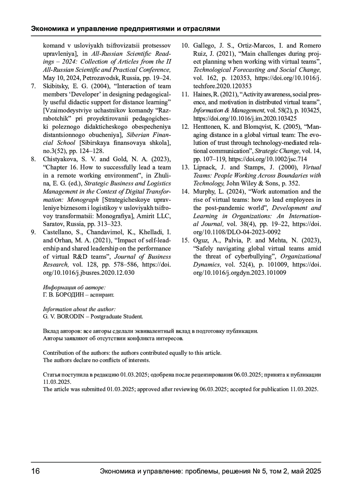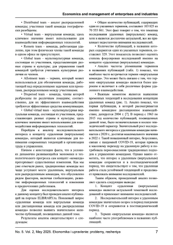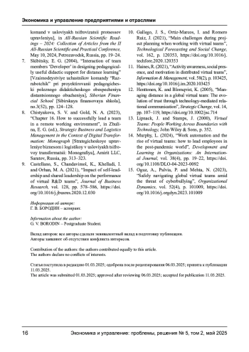 3. Габриэлян В. А., Лобанова В. В. Организация работы виртуальных команд в малом бизнесе // Лизинг. - 2023. - № 3. - С. 32-36. DOI: 10.33920/VNE-03-2303-06 EDN: CKZPQC