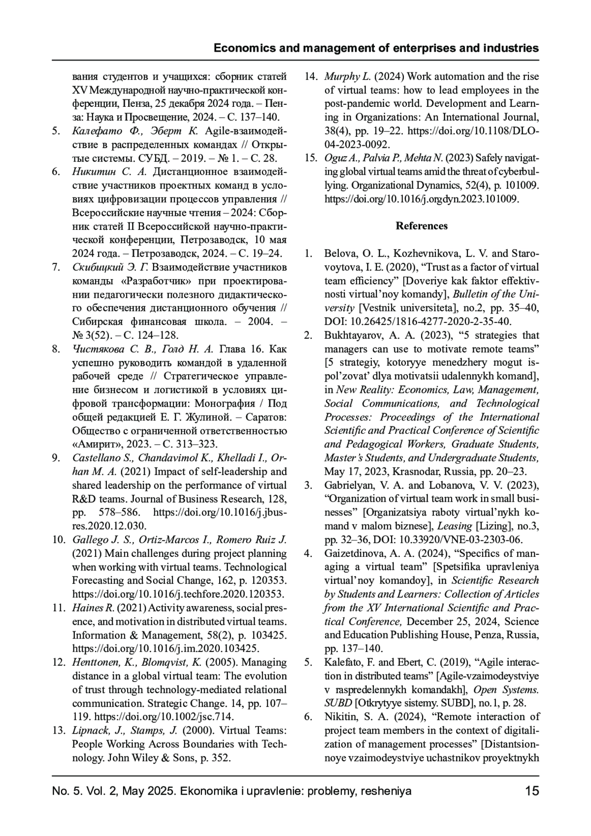 1. Белова О. Л., Кожевникова Л. В., Старовойтова И. Е. Доверие как фактор эффективности виртуальной команды // Вестник университета. - 2020. - № 2. - С. 35-40. DOI: 10.26425/1816-4277-2020-2-35-40