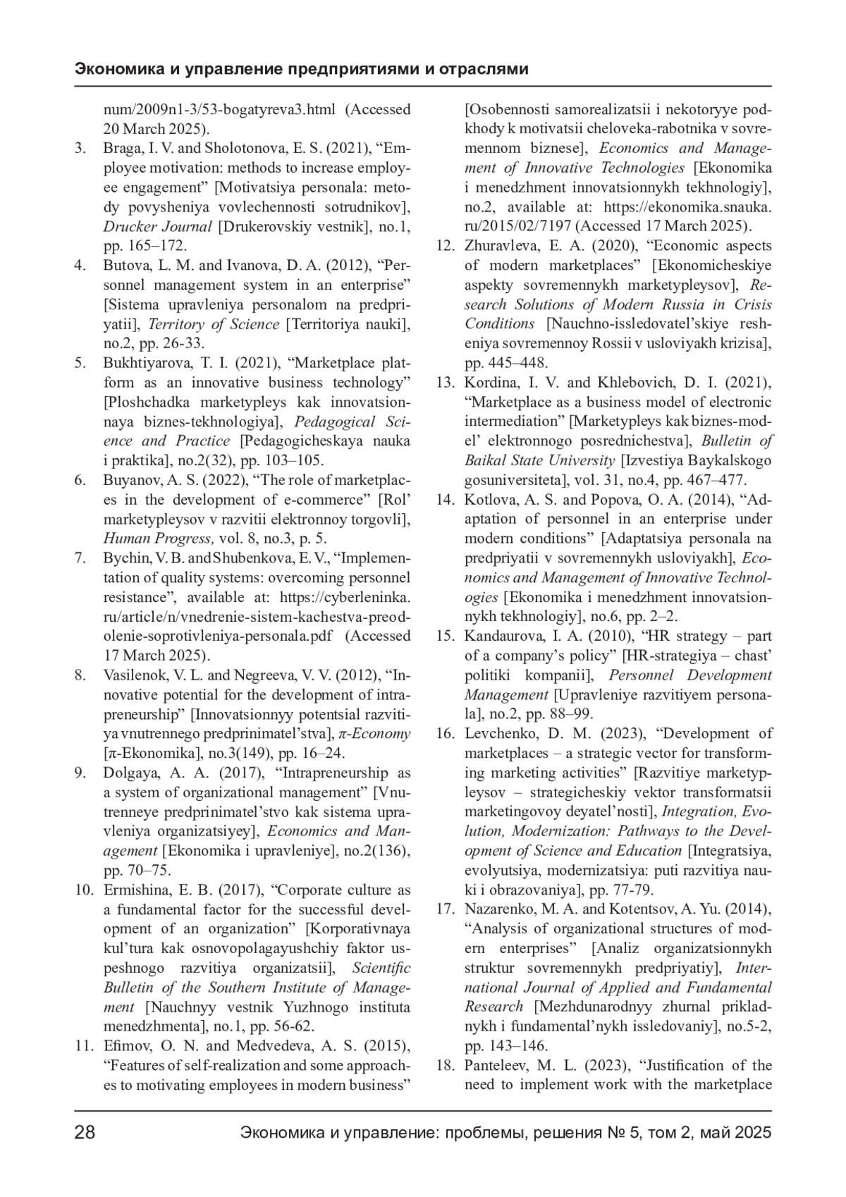 11. Ефимов О. Н., Медведева А. С. Особенности самореализации и некоторые подходы к мотивации человека-работника в современном бизнесе [Электронный ресурс] // Экономика и менеджмент инновационных технологий. 2015. № 2. URL: https://ekonomika.snauka.ru/2015/02/7197 (дата обращения: 17.03.2025). EDN: TPFDHZ