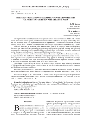 В статье рассмотрена проблема родителей ребенка с ДЦП как со стороны деструктивного влияния родительского стресса (РС), так и со стороны потенциально возможных позитивных личностных трансформаций родителей.