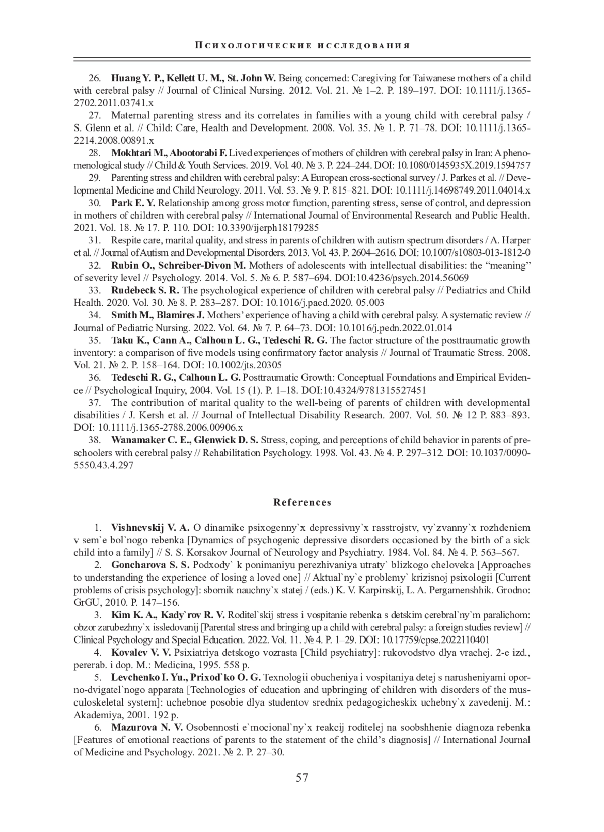 34. Smith M., Blamires J. Mothers’ experience of having a child with cerebral palsy. A systematic review // Journal of Pediatric Nursing. 2022. Vol. 64. № 7. P. 64-73. DOI: 10.1016/j.pedn.2022.01.014 EDN: VFFHKS