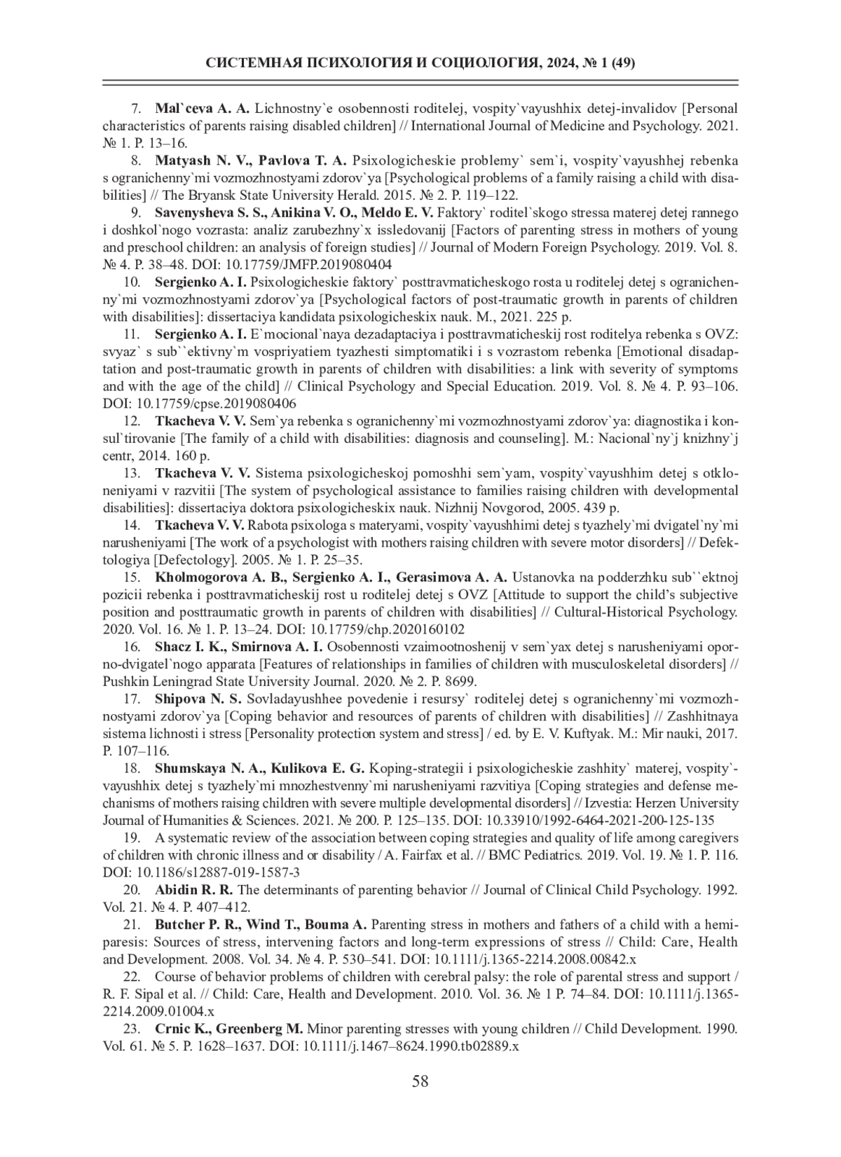 7. Мальцева А. А. Личностные особенности родителей, воспитывающих детей-инвалидов // International Journal of Medicine and Psychology. 2021. № 1. С. 13-16. EDN: CKHHDW
