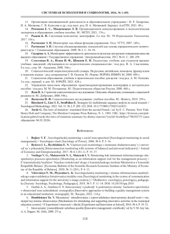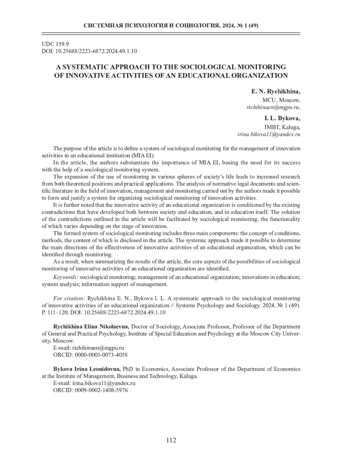 РЫЧИХИНА Э. Н., БЫКОВА И. Л. СИСТЕМНЫЙ ПОДХОД К СОЦИОЛОГИЧЕСКОМУ МОНИТОРИНГУ ИННОВАЦИОННОЙ ДЕЯТЕЛЬНОСТИ ОБРАЗОВАТЕЛЬНОЙ ОРГАНИЗАЦИИ // СИСТЕМНАЯ ПСИХОЛОГИЯ И СОЦИОЛОГИЯ. 2024. № 1 (49)
