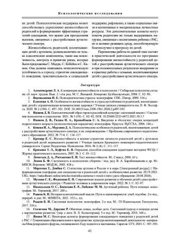 6. Конева И. А., Мурзина Д. А. Психологические особенности родителей, воспитывающих детей с расстройствами аутистического спектра, и их сопровождение // Проблемы современного педагогического образования. 2022. № 77-4. С. 114-117. EDN: WWMHKG