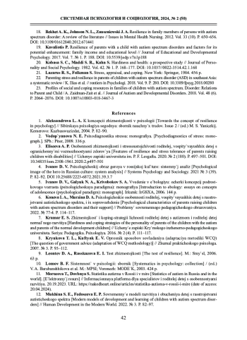 18. Bekhet A. K., Johnson N. L., Zauszniewski J. A. Resilience in family members of persons with autism spectrum disorder: A review of the literature // Issues in Mental Health Nursing. 2012. Vol. 33 (10). P. 650-656. DOI: 10.3109/01612840.2012.671441