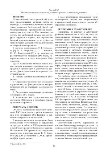 Статья посвящена анализу банковских рисков, возникающих в условиях перехода к устойчивому развитию (Environmental, Social, and Governance риски, ESG-риски). В ходе исследования были рассмотрены основные экологические, социальные и управленческие факторы (ESG-факторы) и риски, которые возникают при их интеграции. Установлено, что на сегодняшний день в российской практике прослеживается слабая разработанность механизмов по контролю и мониторингу таких рисков, что, при их проявлении, может привести к снижению финансовых показателей кредитной организации. В связи с этим на первоначальных этапах интеграции ESG-факторов рекомендуется прибегнуть к одному из способов упрощенной системы мониторинга: учитывать ESG-риски в системе текущих рисков либо использовать инструменты стресс-тестов ESG-рисков. Результаты, полученные в ходе исследования, могут быть использованы для дальнейшего развития теоретических и эмпирических разработок по вопросам, которые связаны с интеграцией ESG-факторов.