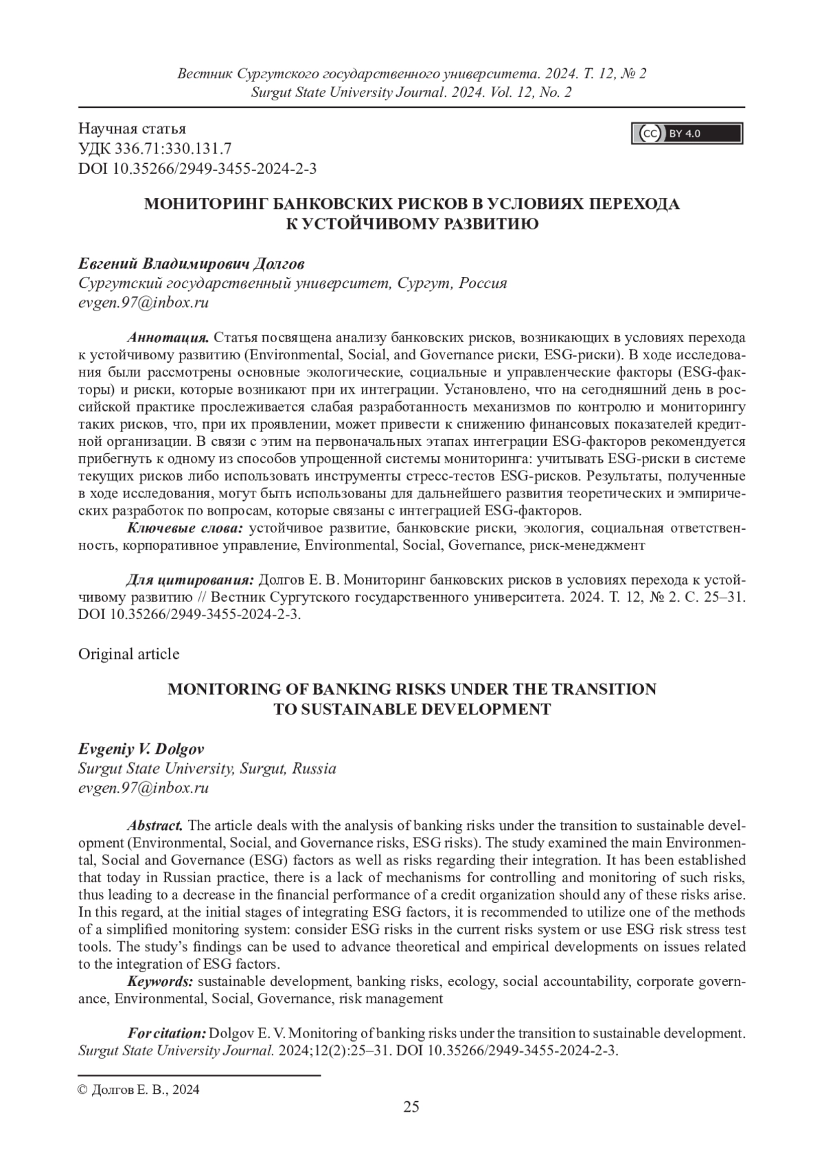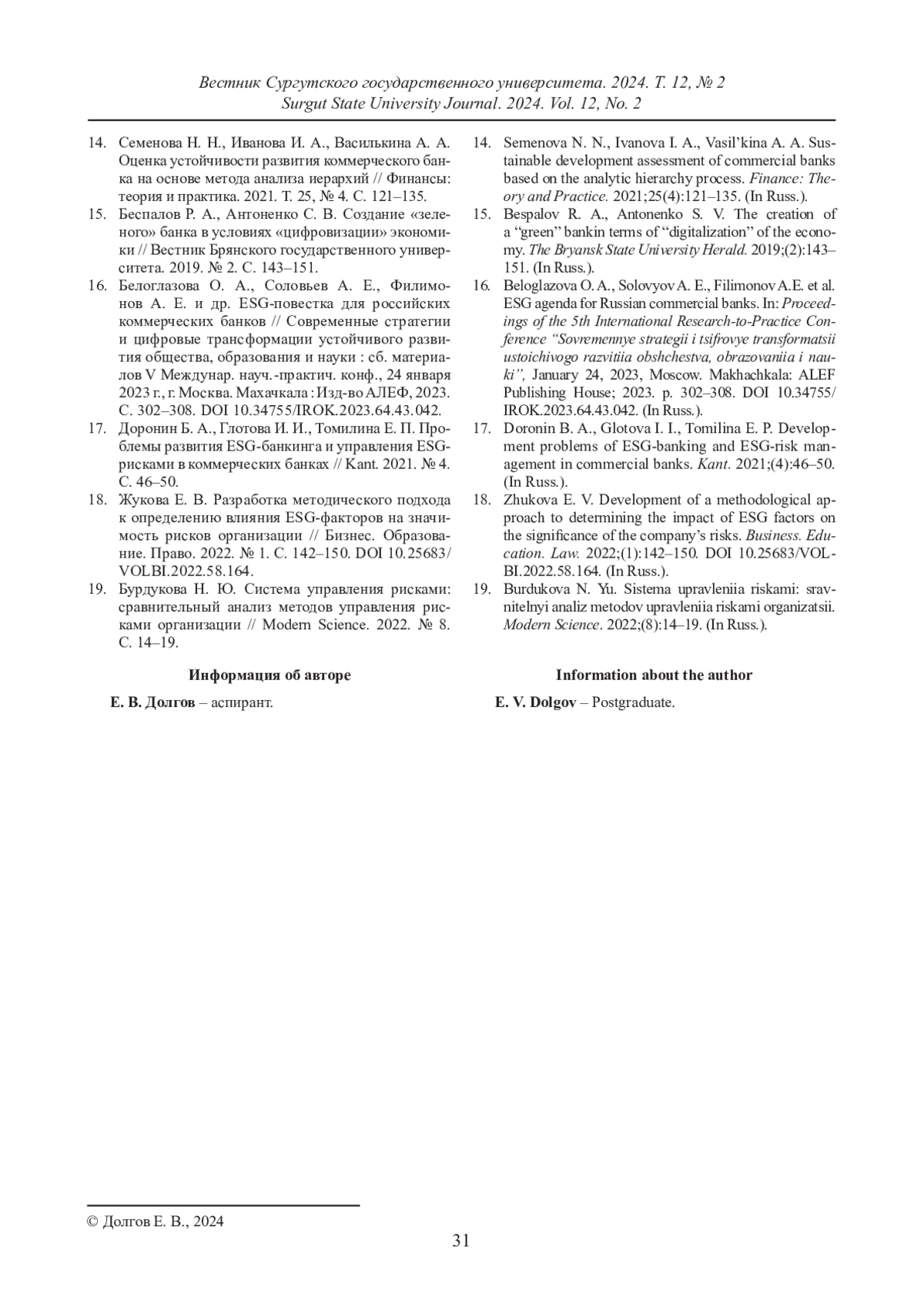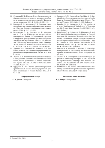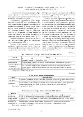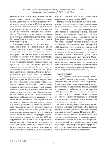 ДОЛГОВ Е. В. МОНИТОРИНГ БАНКОВСКИХ РИСКОВ В УСЛОВИЯХ ПЕРЕХОДА К УСТОЙЧИВОМУ РАЗВИТИЮ // ВЕСТНИК СУРГУТСКОГО ГОСУДАРСТВЕННОГО УНИВЕРСИТЕТА. 2024. ТОМ 12, № 2