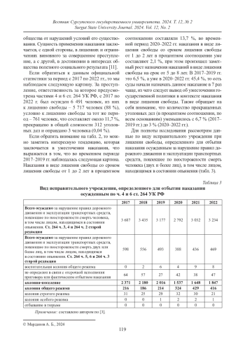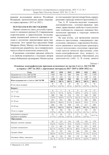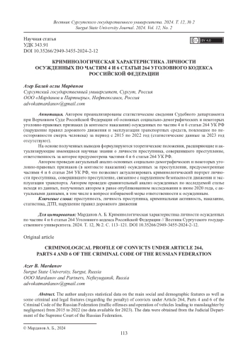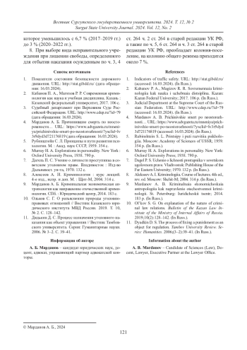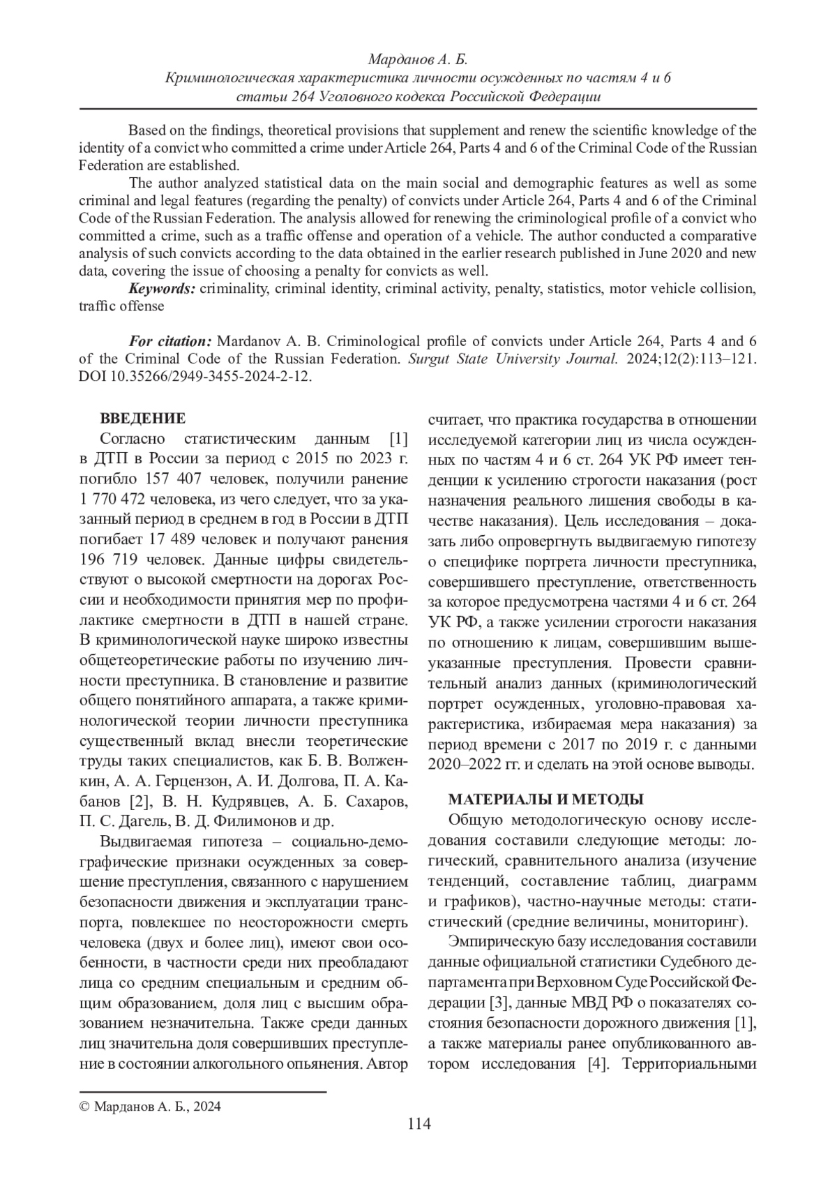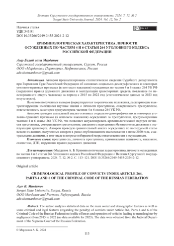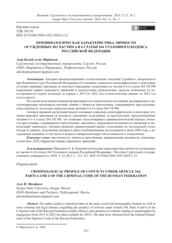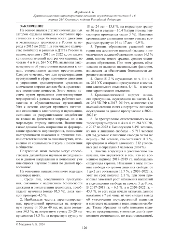 Автором проанализированы статистические сведения Судебного департамента при Верховном Суде Российской Федерации об основных социально-демографических и некоторых уголовно-правовых признаках (в контексте наказания) осужденных по частям 4 и 6 статьи 264 УК РФ (нарушение правил дорожного движения и эксплуатации транспортных средств, повлекшее по неосторожности смерть человека) за период с 2015 по 2022 год (статистические данные за 2023 год отсутствуют). На основе полученных выводов формулируются теоретические положения, расширяющие и актуализирующие имеющиеся научные знания о личности преступника, совершившего преступление, ответственность за которое предусмотрена частями 4 и 6 статьи 264 УК РФ. Автором проведен актуальный анализ основных социально-демографических и некоторых уголовно-правовых признаков (в контексте наказания) осужденных за преступления, предусмотренные частями 4 и 6 статьи 264 УК РФ, что позволяет актуализировать криминологический портрет личности преступника, совершившего преступление, связанное с нарушением безопасности движения и эксплуатации транспорта. Автором проведен сравнительный анализ осужденных по исследуемой статье исходя из данных, полученных автором в ранее опубликованном исследовании в июне 2020 года, с актуальными данными, в том числе в вопросе избираемой меры ответственности к осужденным.