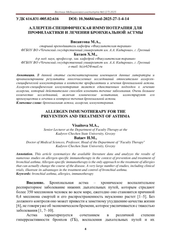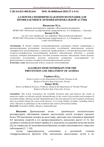 В данной статье систематизированы имеющиеся данные литературы и проанализированы результаты многочисленных исследований относительно аллерген-специфической иммунотерапии в контексте профилактики и лечения бронхиальной астмы. Аллерген-специфическая иммунотерапия является единственным подходом к лечению аллергии, который действительно способен изменить течение заболевания. Очень большое количество исследований, включая клинические испытания, иллюстрируют его преимущества в лечении и контроле течения бронхиальной астмы.