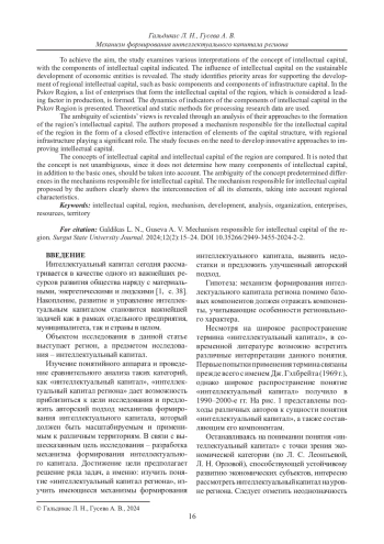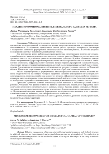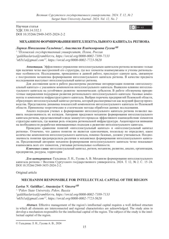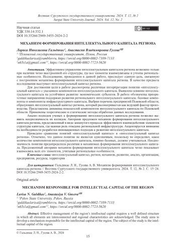 ГАЛЬДИКАС Л. Н., ГУСЕВА А. В. МЕХАНИЗМ ФОРМИРОВАНИЯ ИНТЕЛЛЕКТУАЛЬНОГО КАПИТАЛА РЕГИОНА // ВЕСТНИК СУРГУТСКОГО ГОСУДАРСТВЕННОГО УНИВЕРСИТЕТА. 2024. ТОМ 12, № 2